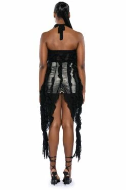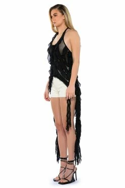 Show them what they’re missing with The AKIRA Label Out Of My League Ruffle Draped Top! This stylish number is made from a chic, mesh base fabrication and features a halter neck with a self-tie ribbon, a ruffled design, and long, cascading details on the sides. Complete with an open back, a bodycon fit, and a high-low silhouette. Pair this piece with fitted bottoms and pumps to complete your eye-catching look.