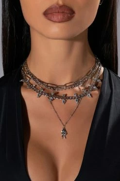 The AKIRA Label Peace Out And Bye Necklace Set features two silver chain link necklaces: a choker-style necklace complete with a paperclip-like chain, a beaded chain, and a peace hand charm. The other is a doubled chain link necklace with rhinestone accents. Both are complete with adjustable lobster clasp closures. Wear these pieces separately or style them together for all of the fierce bling!