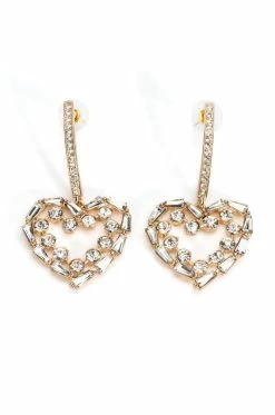 The AKIRA Label Piece Of My Heart Rhinestone Drop Earrings are made from a faux gold metal base and feature open hearts with clustered rhinestone detailing and thin, curved rhinestone bar lobe posts. Complete with post back-style closures.