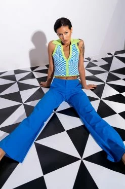 The AKIRA Label Play It Again Cropped Collared Top is made from a stretchy knit fabrication and features a warped geometric pattern, a plunging collared neckline, sleeveless silhouette, cropped length, and front button closures. Pair this piece with wide leg bottoms and booties for a funky fresh casual look.