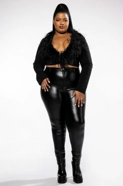 The AKIRA Label Plus Come On Baby Feather Crop Blazer features a cropped silhouette, a smooth blazer base, long sleeves, a satin inner lining, a fold over collar, and luxurious feather trim detailing. Complete with a single faux gold front button.