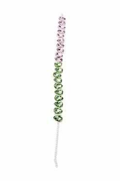 The AKIRA Label Pretty In Pink And Green Rhinestone Necklace features a faux silver metal base, two-tone, linked large rhinestone gems in the shape of teardrops, and an adjustable lobster claw closure.