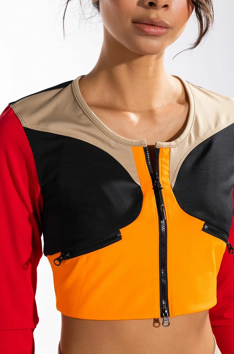 The PUMA Multi Color Unity Crop Top features a tight, bodycon silhouette, cropped cut, and long sleeve design. Complete with a scoop neckline, color blocked detailing, front zip closure, side zip pockets, and a jumping cat logo at the wrist. Pair with PUMA leggings for a cozy athleisure ensemble.
