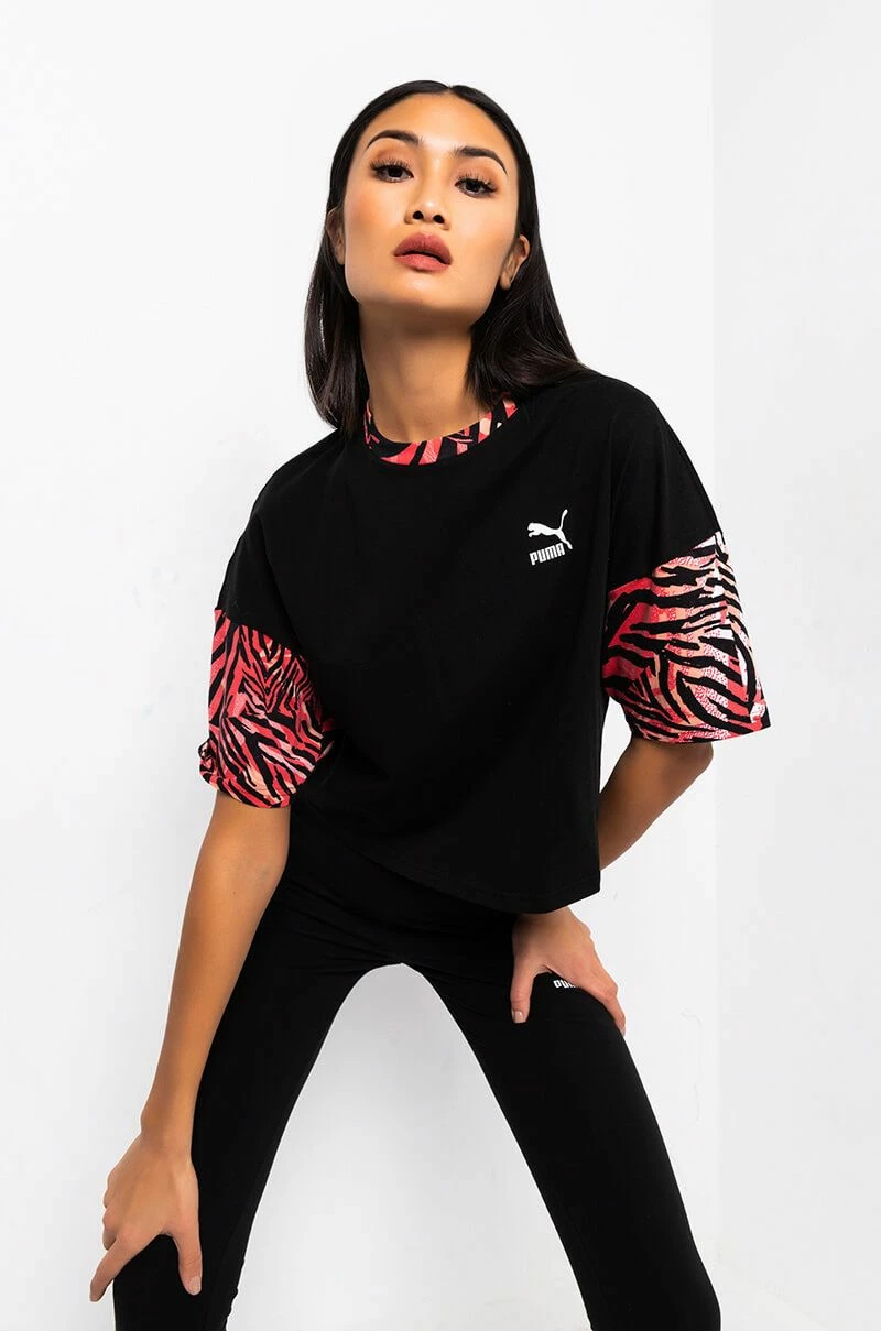 Stay home in style in the PUMA Zebra Sleeve Boyfriend Crop Tee. This branded t-shirt features a rounded neckline, short sleeves, a PUMA logo at the chest, a boxy cropped silhouette, patterned trim, and stretchy fabrication. Style it with leggings for a girl-on-the-go look.