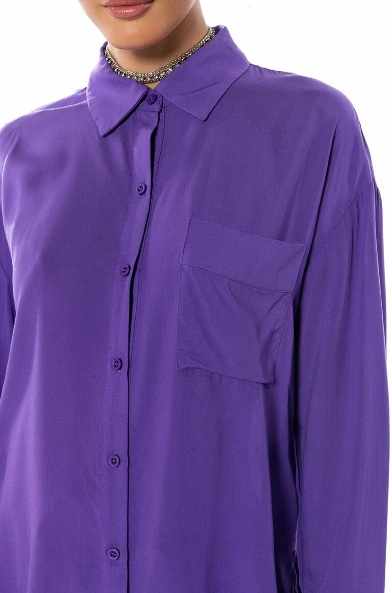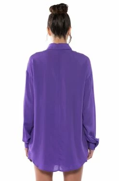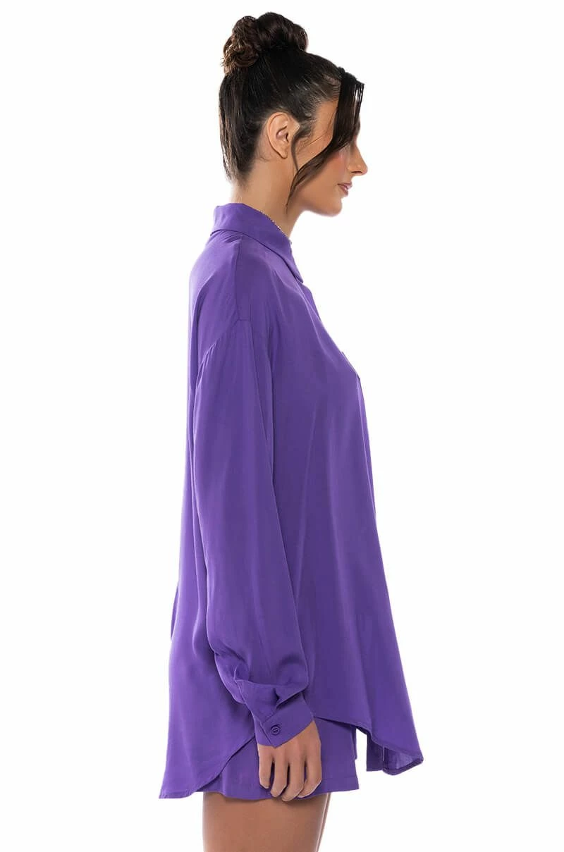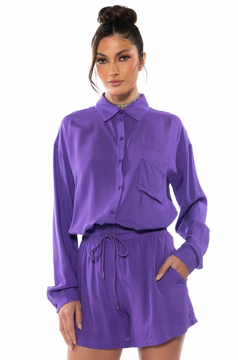 The AKIRA Label Purple Rain Button Down is made from a lightweight, smooth base fabrication and features a foldover collar, long sleeves with buttoned cuffs, and a front breast pocket. Complete with an oversized silhouette, rounded hems with side slits, and a button down front closure. Style with the matching bottoms, The AKIRA Label Purple Rain Drawstring Short, and chunky loafers for an easygoing chic look!
