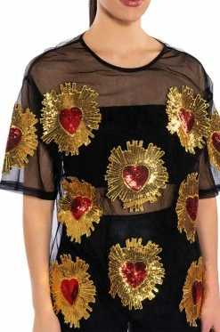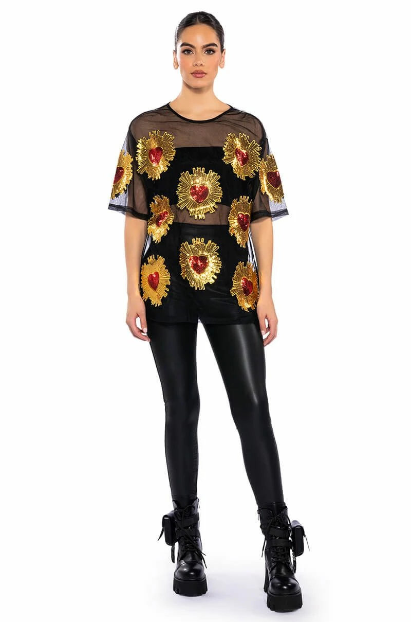 Show off your poker face in The AKIRA Label Queen Of Hearts Oversized Mesh Tee. This sheer top features a casual oversized cut, a crew neckline, short sleeves, sequin embroidered heart detailing, and a sheer mesh fabrication. Wear with biker shorts, high top sneakers, and oversized hoops.