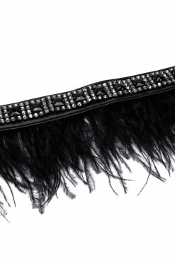 The AKIRA Label Real Ostrich Feather Embellished Stretch Belt features a vegan leather base, rhinestone gemstone stud detailing, elastic side panels, an adjustable fit, and button back closures. Complete with real feather fringe accents. This edgy accessory provides a luxe look.