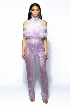 The AKIRA Label Real Ostrich Feather Top In Light Purple is made from a stretchy mesh fabrication and features layered opulent ostrich feathers throughout, a halter neckline with back button detailing, a sleeveless silhouette, an elastic hem, a sexy open back, and a cropped length. Complete with an exposed back zipper closure. Pair this piece with satin bottoms and pumps to complete your look.