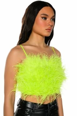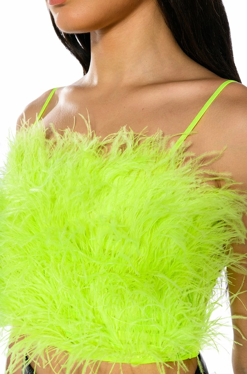 The AKIRA Label Real Ostrich Feather Top is made from a stretchy mesh fabrication and features layered opulent ostrich feathers throughout, a square neckline, adjustable tank straps, and a sleeveless silhouette. Complete with an elastic hem, a cropped length, and an exposed back zipper closure. Pair this piece with satin bottoms and pumps to complete your luxe look.