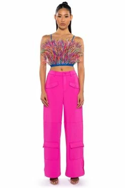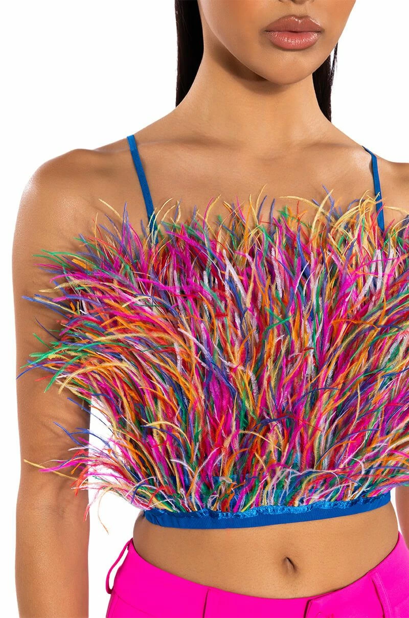 The AKIRA Label Real Ostrich Feather Top In Multi is made from a stretchy, mesh base fabrication and features layered opulent ostrich feathers throughout, a square neckline, adjustable tank straps, and a sleeveless silhouette. Complete with an elastic hem, a cropped design, and an exposed back zipper closure. Pair this piece with satin bottoms and pumps to complete your luxe look.