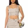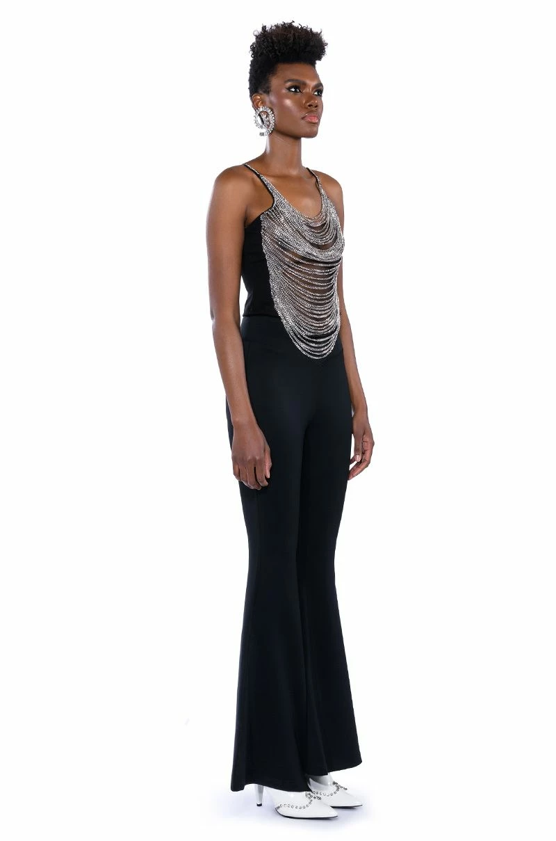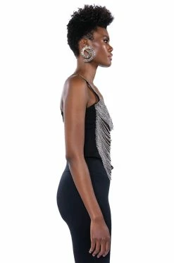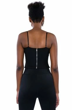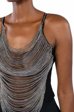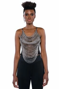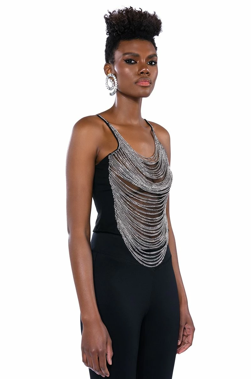 The AKIRA Label Rebel Heart Chained Sleeveless Top is made from a stretchy knit fabrication base and features a rounded neckline, adjustable spaghetti straps, a sheer mesh front panel with cascading chain links, a cropped silhouette, and an exposed back zipper closure. Pair this piece with a moto jacket, leather leggings, and booties to complete your look.