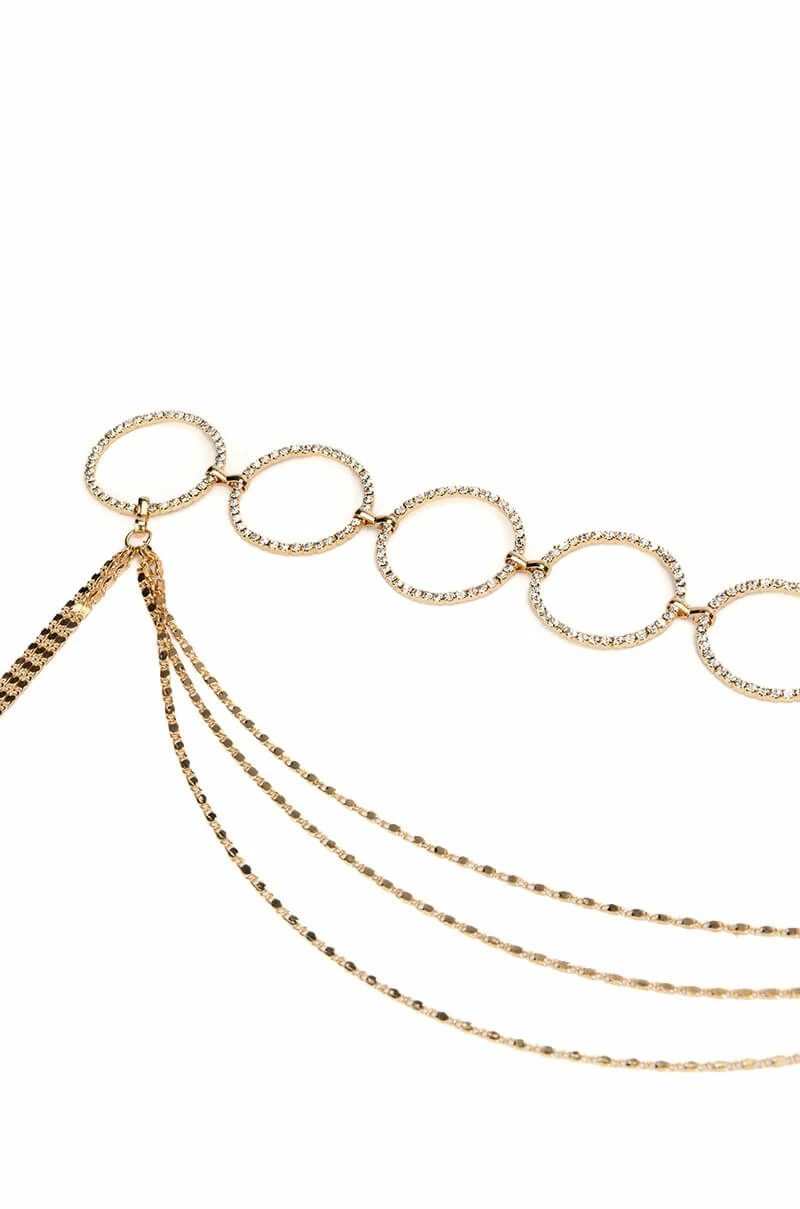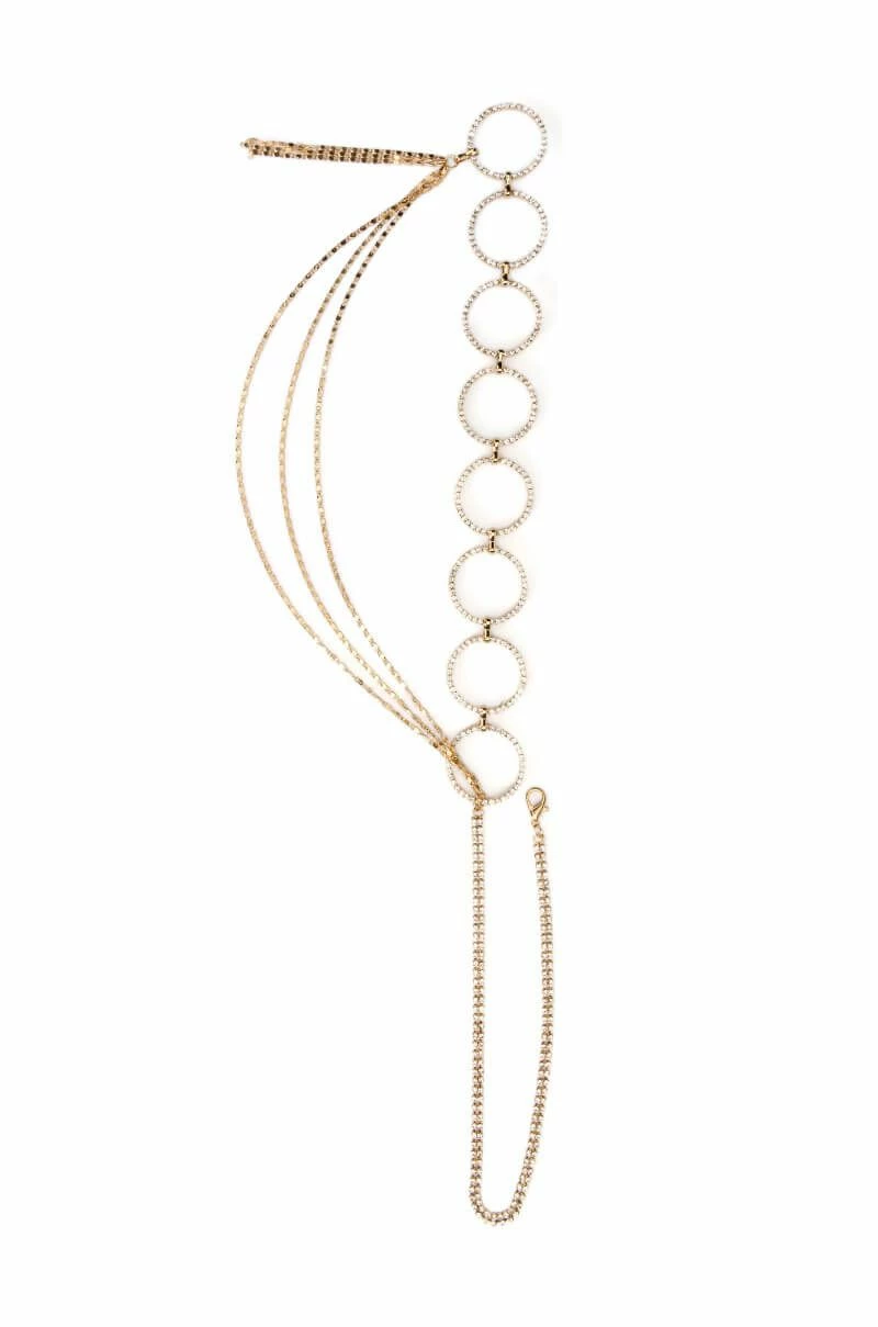 The AKIRA Label Retro Rhinestone Ring Draped Chain Belt is made from a faux gold metal base and features linked rhinestone rings, a draped front with three layers of thin mariner links, and a thin, doubled rhinestone chain with a lobster claw closure.