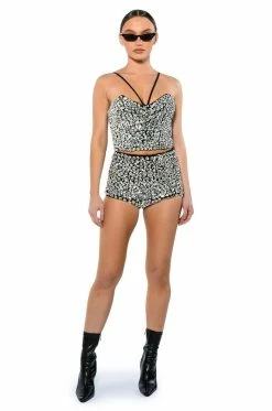 The AKIRA Label Rich With Jewels Crop Tank Top is a glimmering cropped tank featuring a smooth knit fabrication, heavily embellished rhinestone detailing throughout, a v neckline, and a cropped cut. Complete with adjustable tank straps extending from the neckline and an exposed back zipper closure.