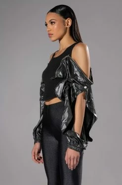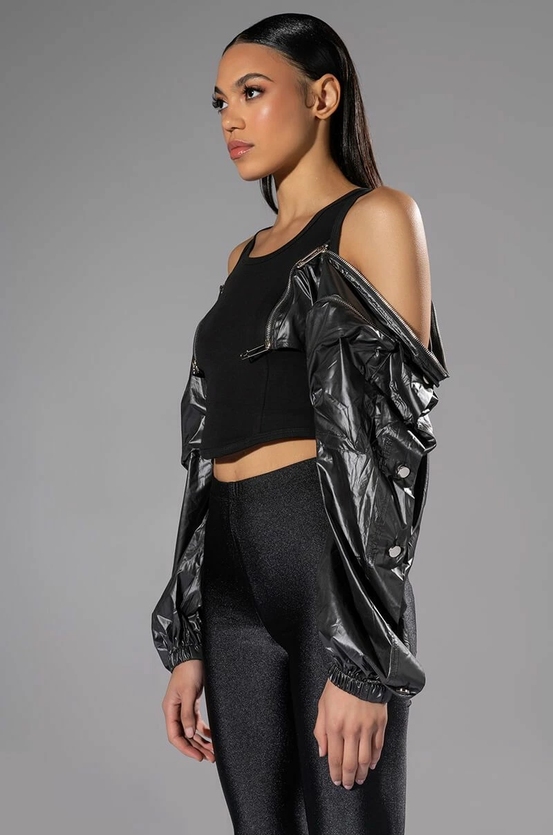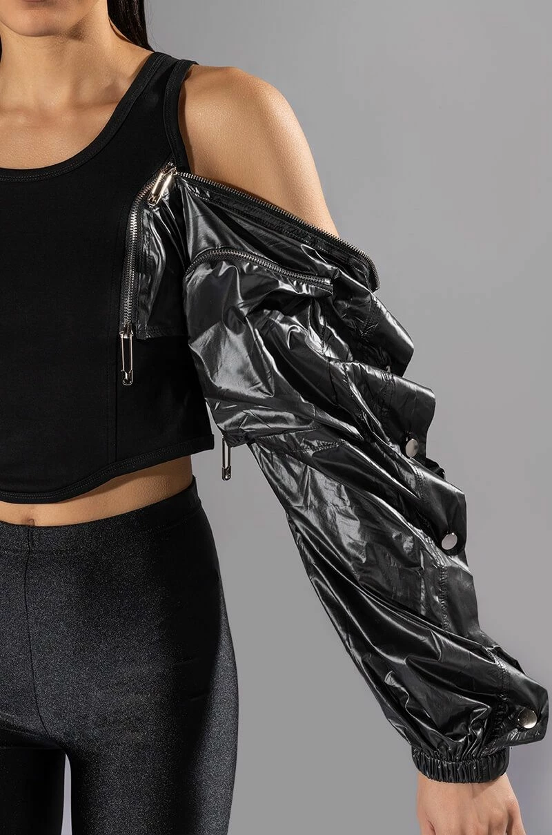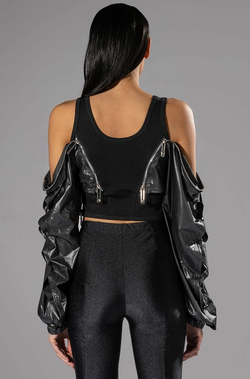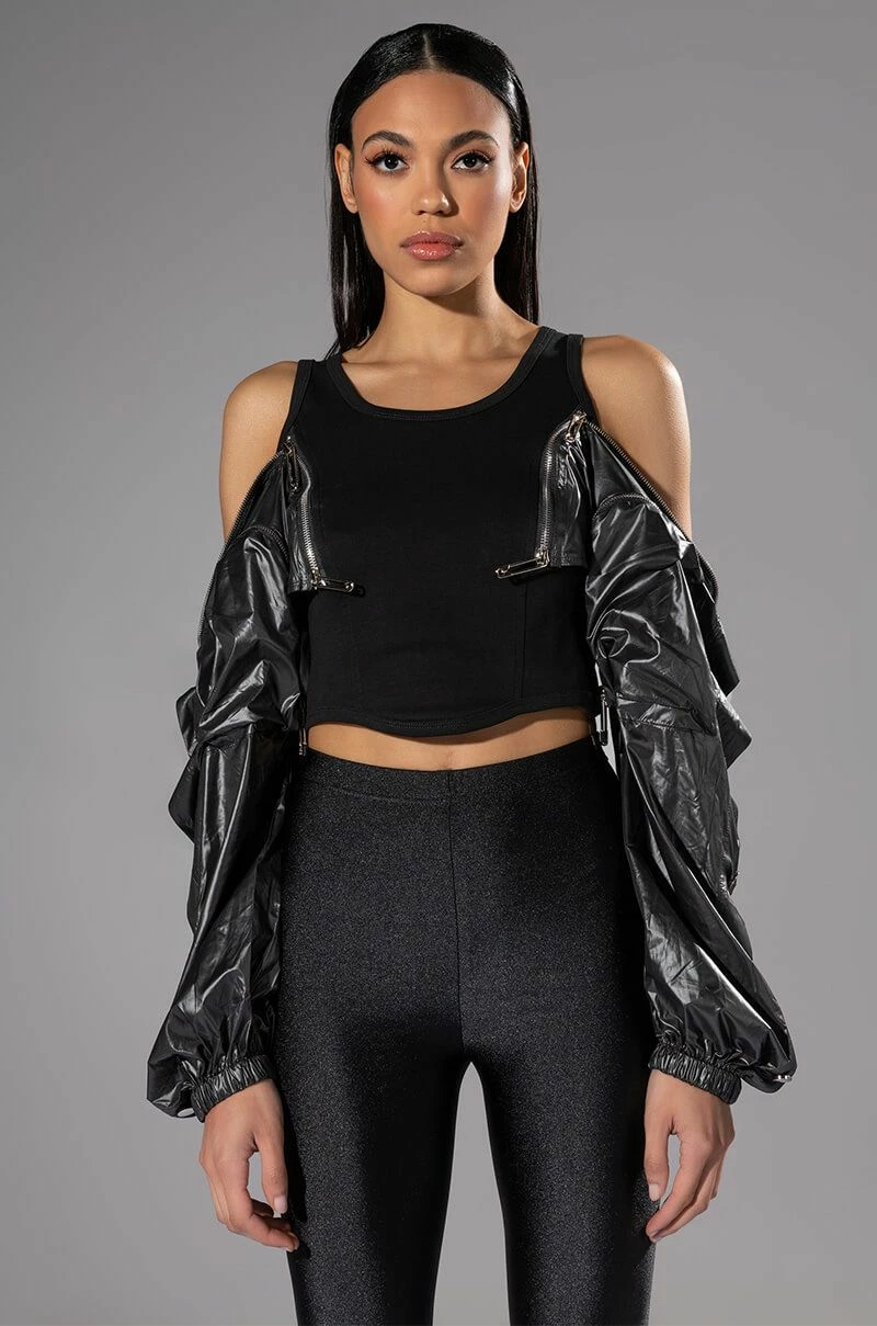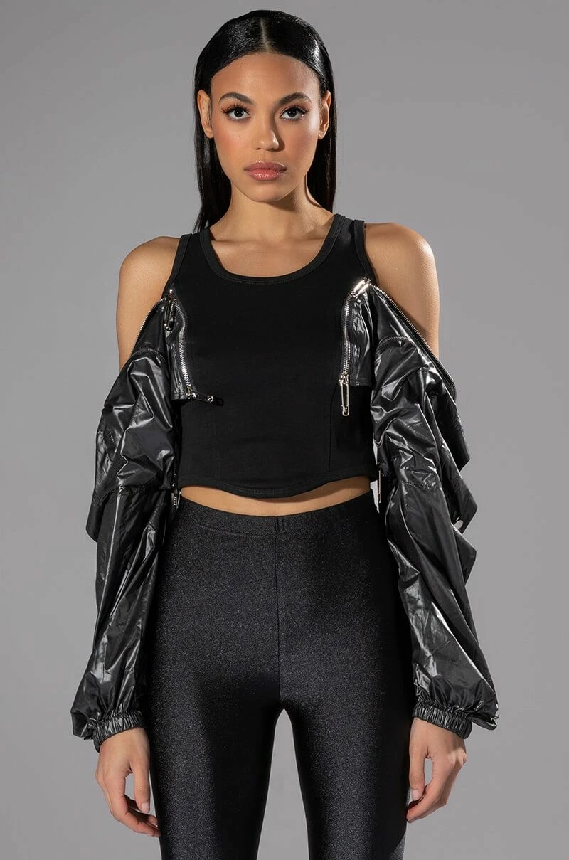 Would you ride or die for this top? We would! The AKIRA Label Ride For You Pu Sleeve Zipper Detail Top is made from a cotton base fabrication, tank straps, a pointed hem with seams, and PU contrast faux zipper off-the-shoulder sleeves. Complete with silver buttons along the sleeves, elastic hems at the wrist, faux safety pin zippers, zippered back shoulder pockets, and a cropped silhouette. Pair this top with skinny jeans and knee-high boots.