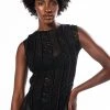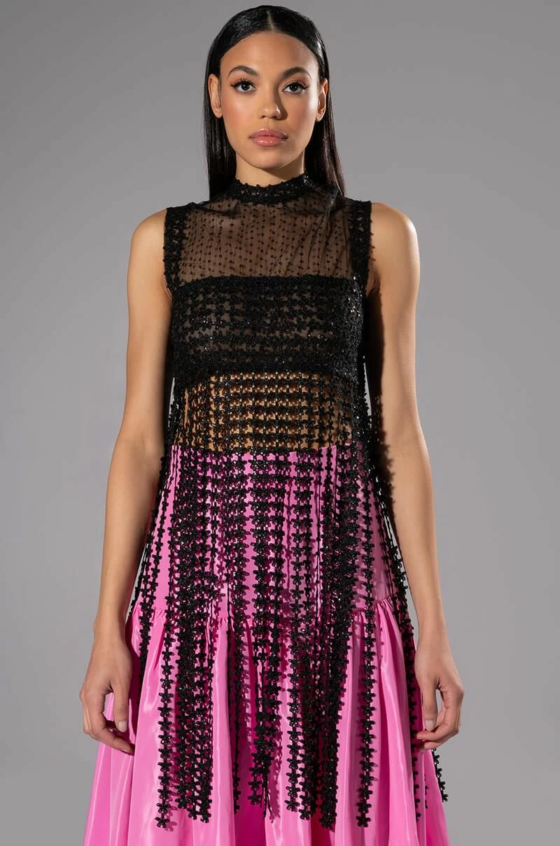 The AKIRA Label River Lace Fringed Sleeveless Top is made from a sheer mesh netting base and features delicate flower petal-patterned lace overlay with sequin detailing, a mock neckline with a keyhole back, a sleeveless silhouette, and a cropped bandeau. Complete with a long, coordinating lace fringe hem and button closures on both sides. Layer this whimsical piece over mini dresses to add texture and length to your look.