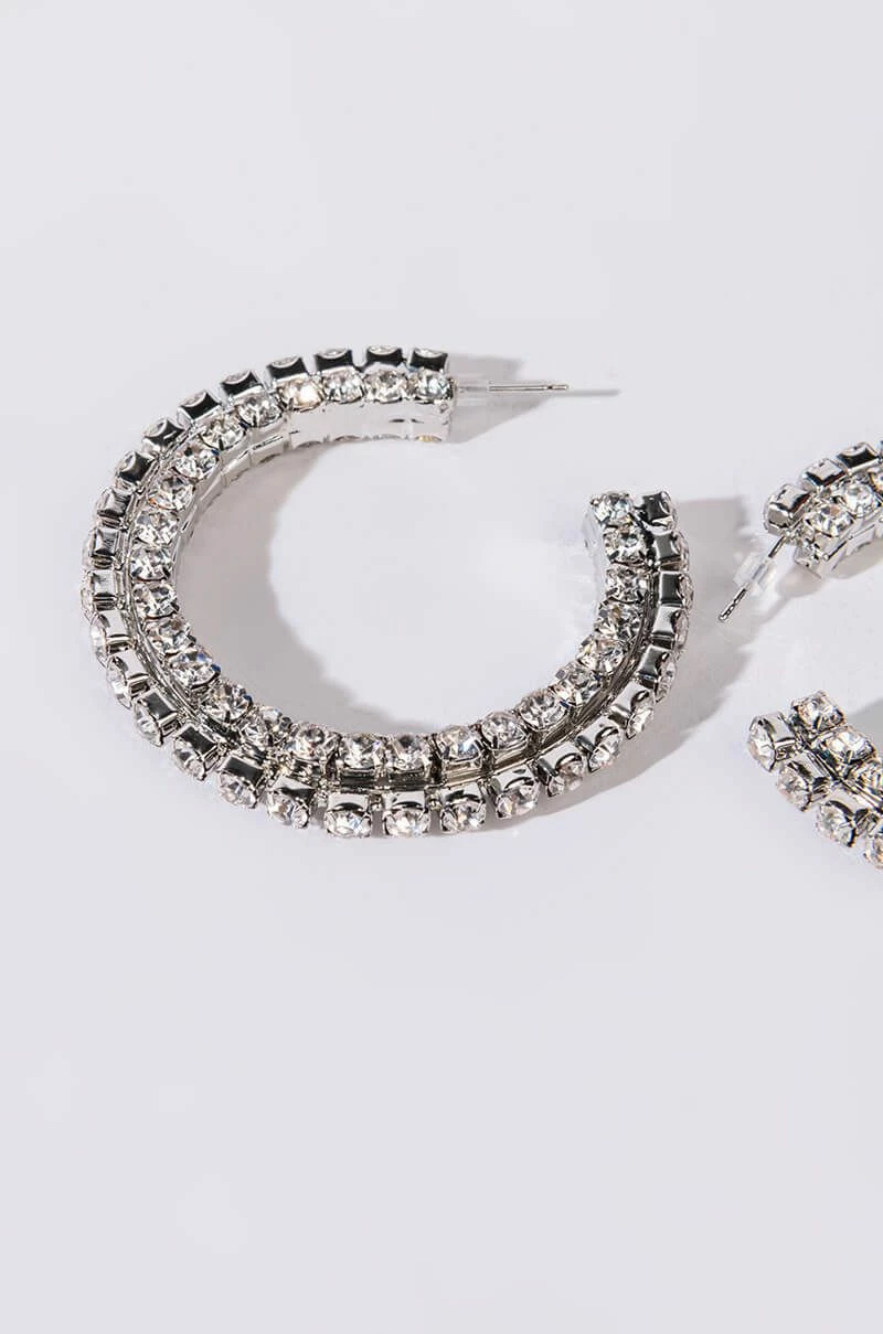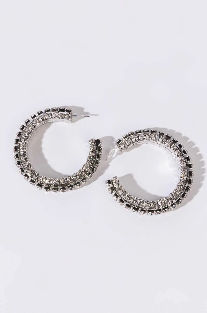 The world is your stage with the AKIRA label Rockstar Rhinestone Hoops! These hoops are made from a silver metal, and feature a wide band, medium-sized rhinestones lining the exterior of each hoop, and a traditional post back style-closure.
