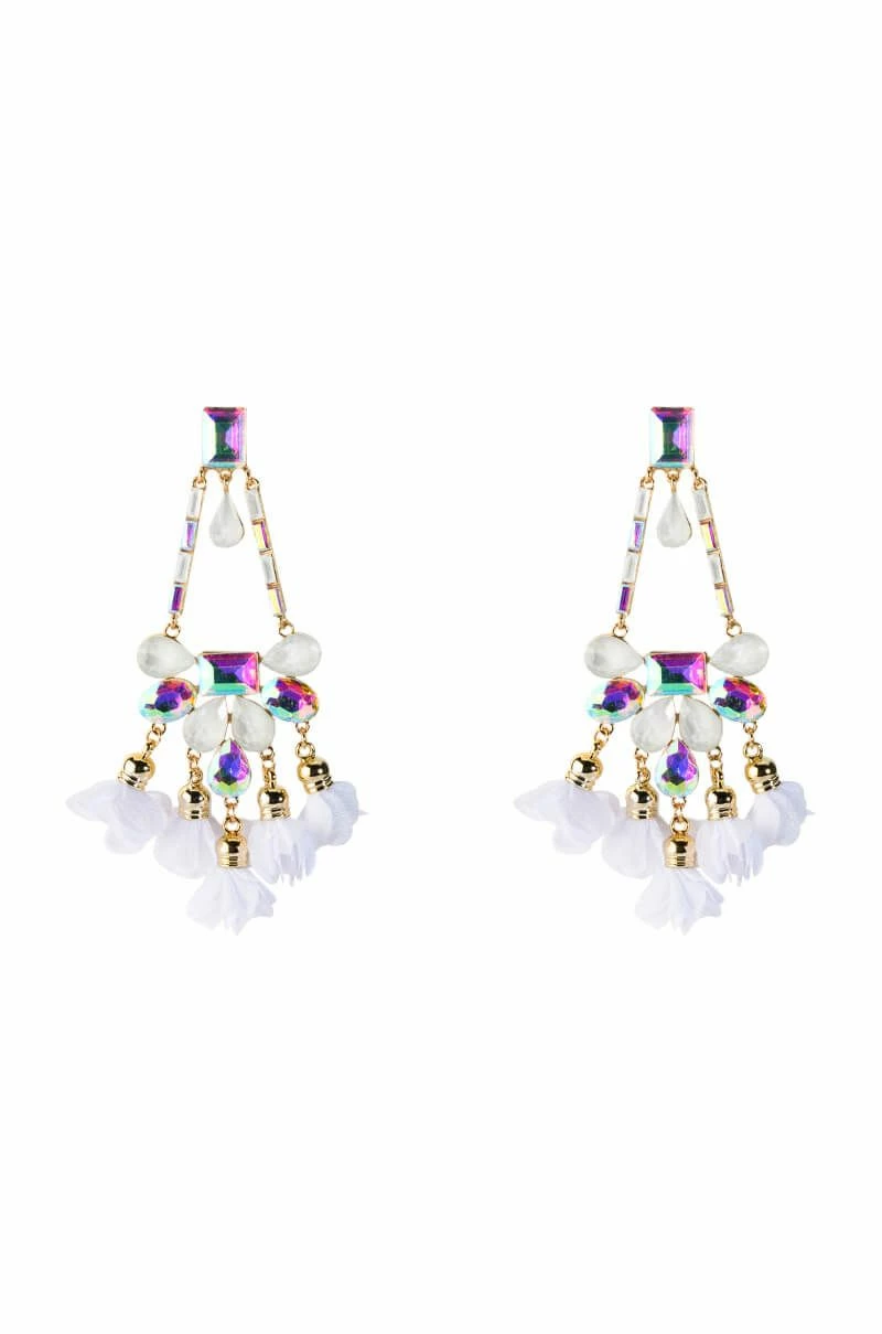 The AKIRA Label Romanticize Life Earring are made from a faux gold metal base and feature iridescent gemstones, a drop dangle silhouette with a gem lobe post, and cascading rhinestone and floral petal accents. Complete with post back fastenings.