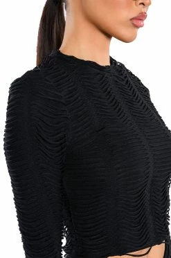 The AKIRA Label Running With The Wolves Textured Top is made from a soft and stretchy knit fabrication and features a shredded texture top layer, a mock neckline, long sleeves, and a cropped silhouette. Pair this piece with the matching AKIRA Label Running With The Wolves Textured Pants to complete your look.