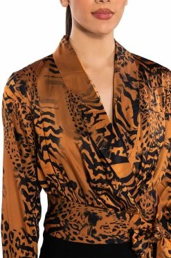 The AKIRA Label Safari Satin Printed Blouse is giving us date night at the zoo lights vibes. Made from a luxe, satin base fabrication this ultra chic top features a cheetah print design, a plunging neckline, foldover collar, and long sleeves with buttoned cuffs. Complete with a snap buttoned, self-tie side wrap closure. Style with denim jeans and stiletto booties for that effortlessly sexy look.