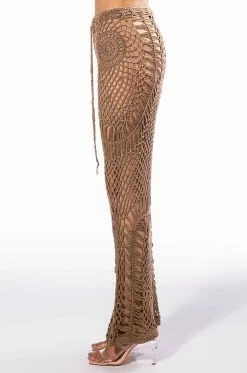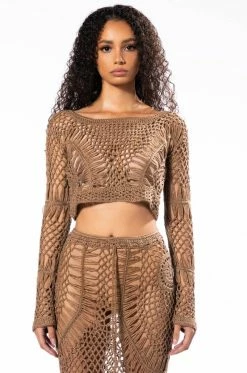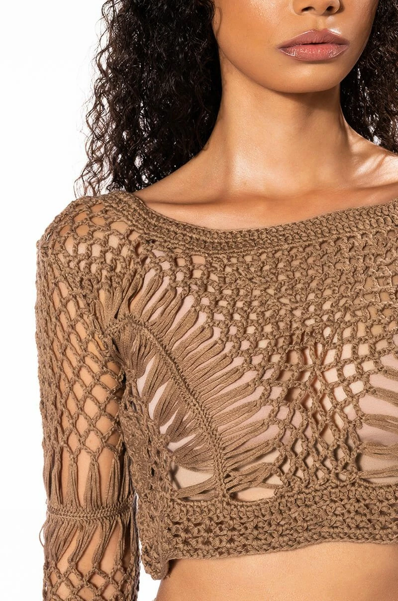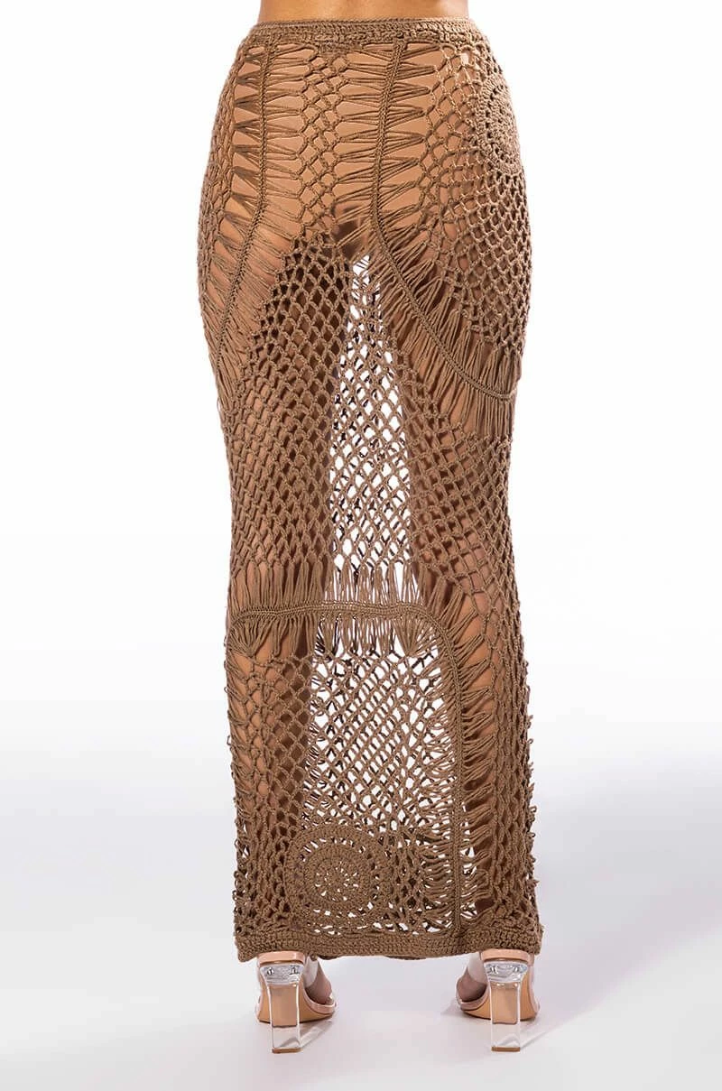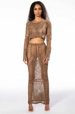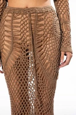 The AKIRA Label Sand Dunes Long Sleeve Crochet Top And Maxi Skirt Set is made from an unlined crochet base and features a long sleeve top and maxi skirt. The long sleeve top features intricate crochet patterning, a scoop neckline, long sleeves, and a cropped silhouette. The maxi skirt features coordinating intricate crochet patterning, a high rise waist with crochet drawstring detailing, a sexy bodycon fit, and a maxi length silhouette. Wear these pieces separately or style them together for all of the crochet charm!