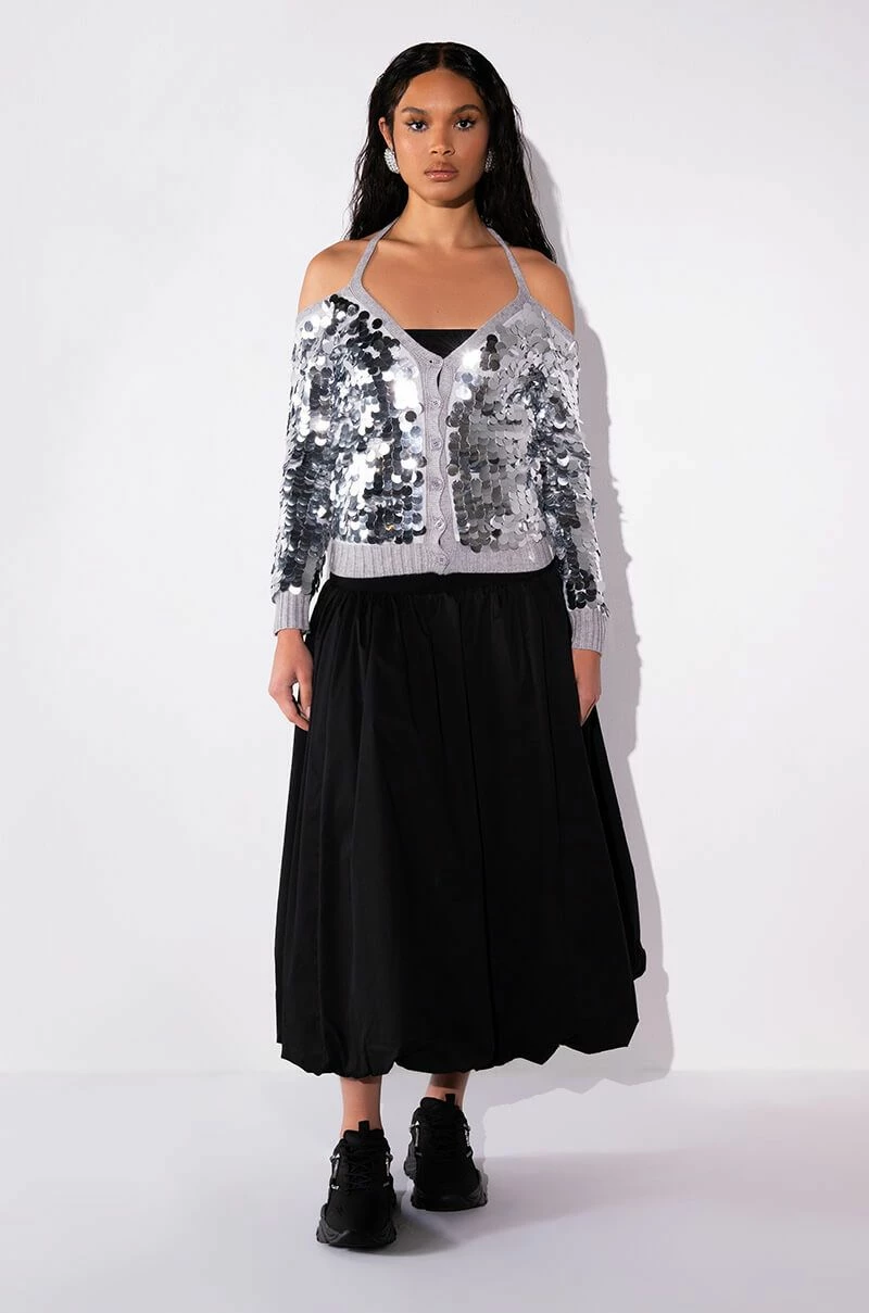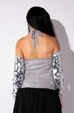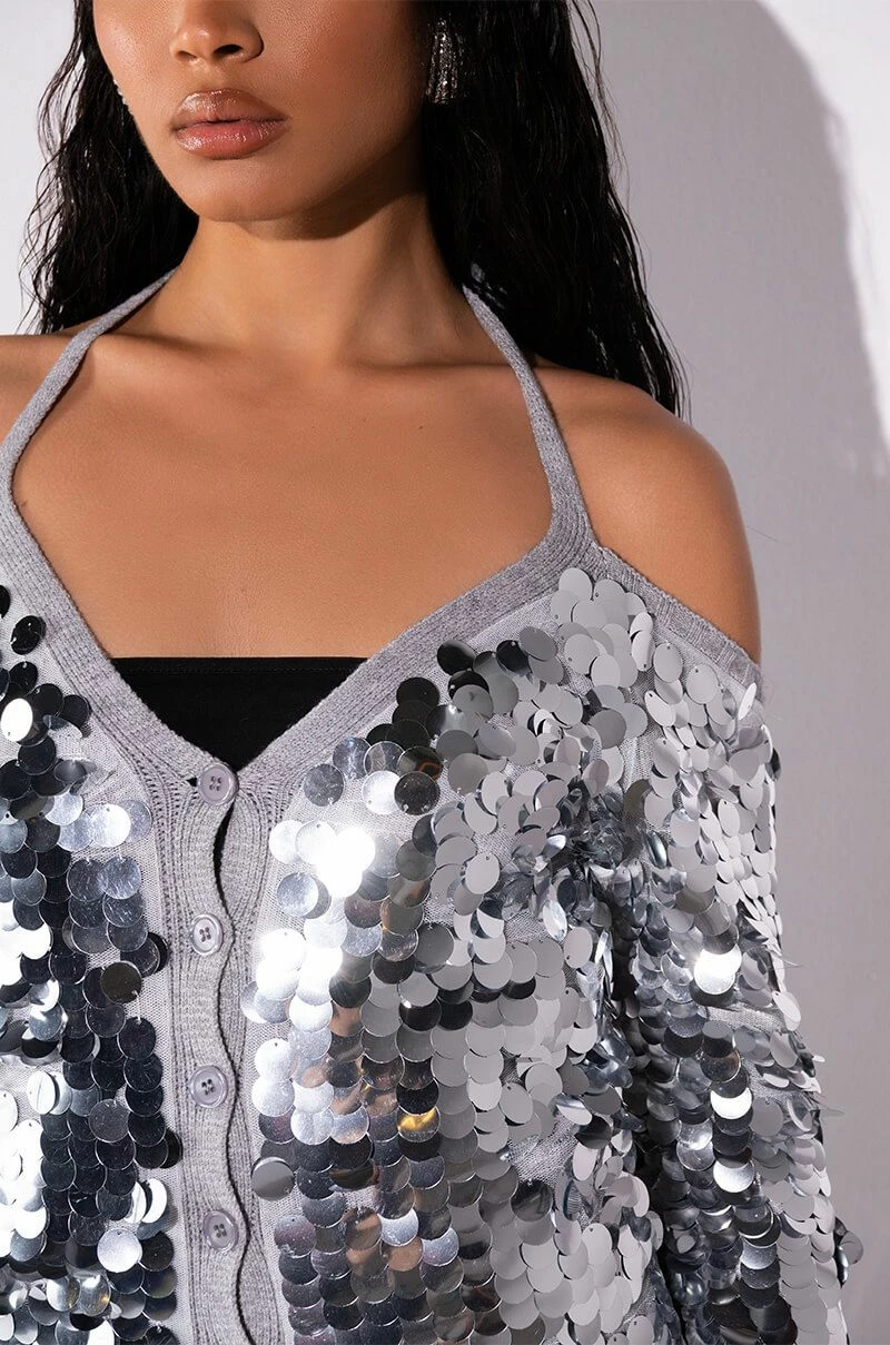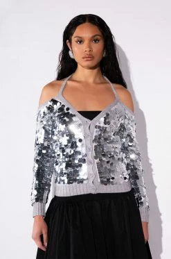 The AKIRA Label Satisfy Me Sequin Cold Shoulder Top is a knit cardigan-style piece featuring a mesh overlay, a sequin-embellished front, a cold shoulder silhouette, long sleeves, and a button up front closure. Complete with a tie-front accent and ribbed knit trim.