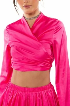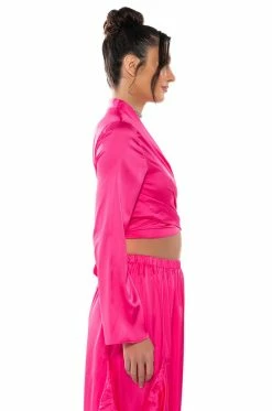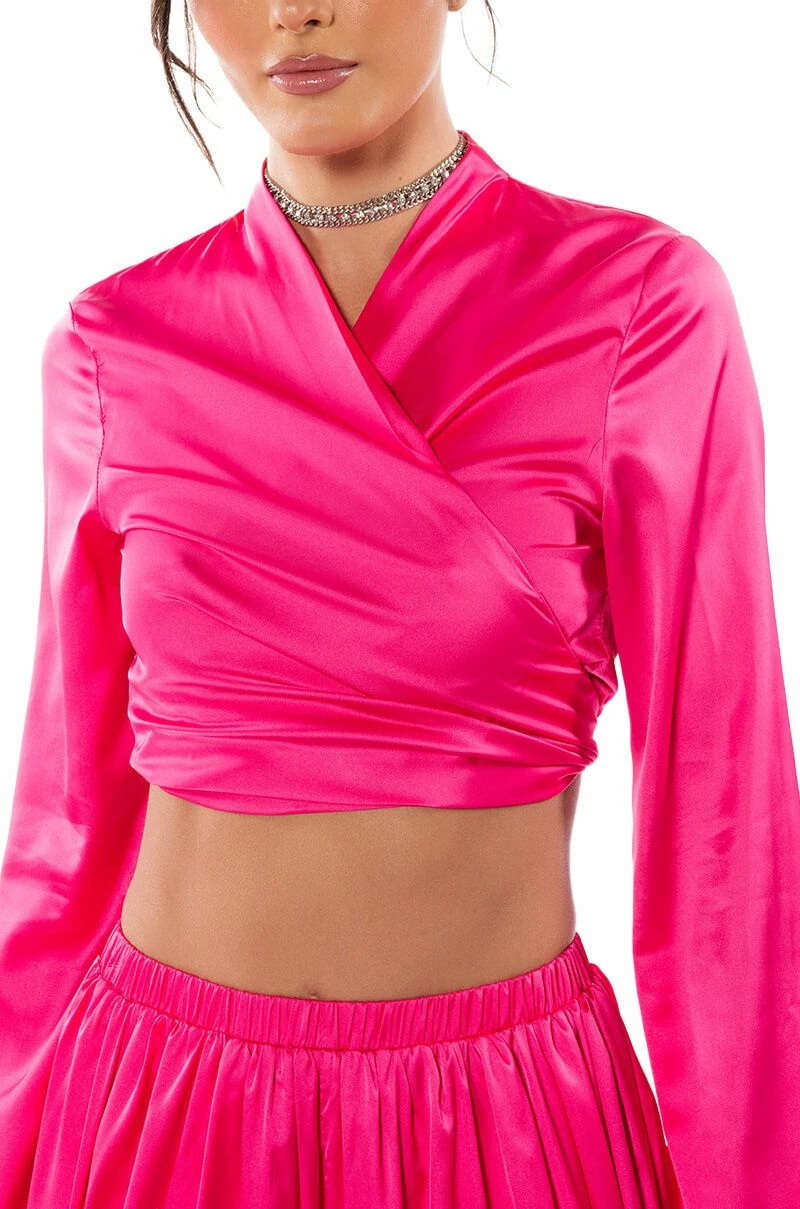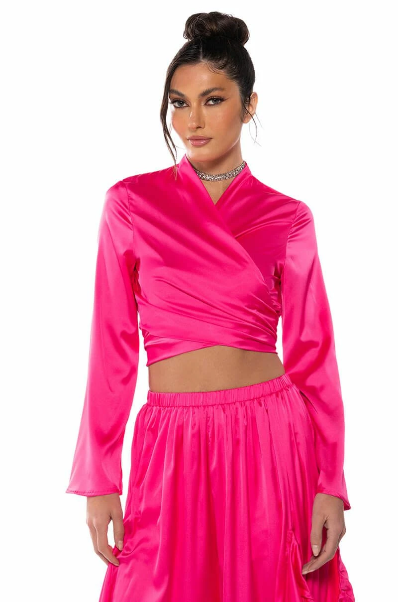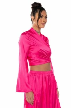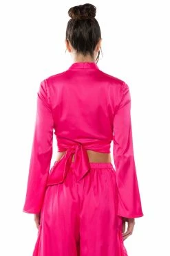 The AKIRA Label Saucy VNeck Wrap Top is part of a luxe, satin two-piece set, featuring a plunging V-shaped neckline, long flared sleeves, and a wrap front-tie design. Complete with a cropped silhouette and a mesh inner lining. Style with the coordinating bottoms, The AKIRA Label Saucy Baggy Cargo Pants, and fur-trimmed slides for a chic, loungewear look.