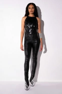 The AKIRA Label Scales Sleeveless Top is made from a pebbled vegan leather fabrication and features a high, rounded neckline, a sleeveless silhouette, vegan leather and mesh scale body detailing, a rounded hem, sexy open sides with stretchy bands, a cropped length, and an exposed back zipper closure.
