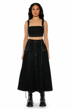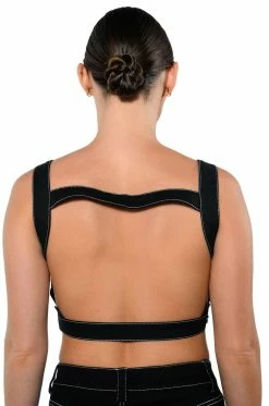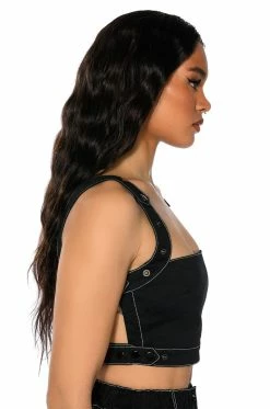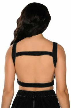 The AKIRA LabelSecret Admirer Denim Crop Top features a structured denim fabrication, adjustable snap button tank straps, an ultra-cropped silhouette, and a backless design. Complete with snap button closures on each side. Pair this piece with the coordinating AKIRA Label Secret Admirer Denim Maxi Skirt for a fierce look!