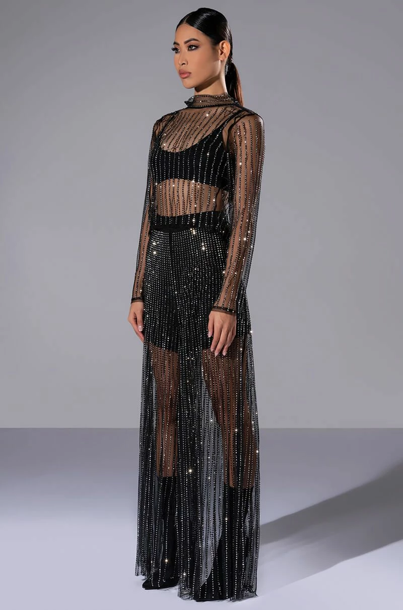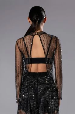 We’re in LOVE with The AKIRA Label Glam Night Out Long Sleeve Embellished Top! This elegant top is part of a bling’d up two-piece set, and features a mesh base fabrication with striped rhinestone embellishments. Complete with a mock neckline, long sleeves, a delicate button closure at the back neck, and a gorgeous open back. Finish off the look with a lacey bralette and the matching pants, The AKIRA Label Glam Night Out Mesh Wide Leg Pants.