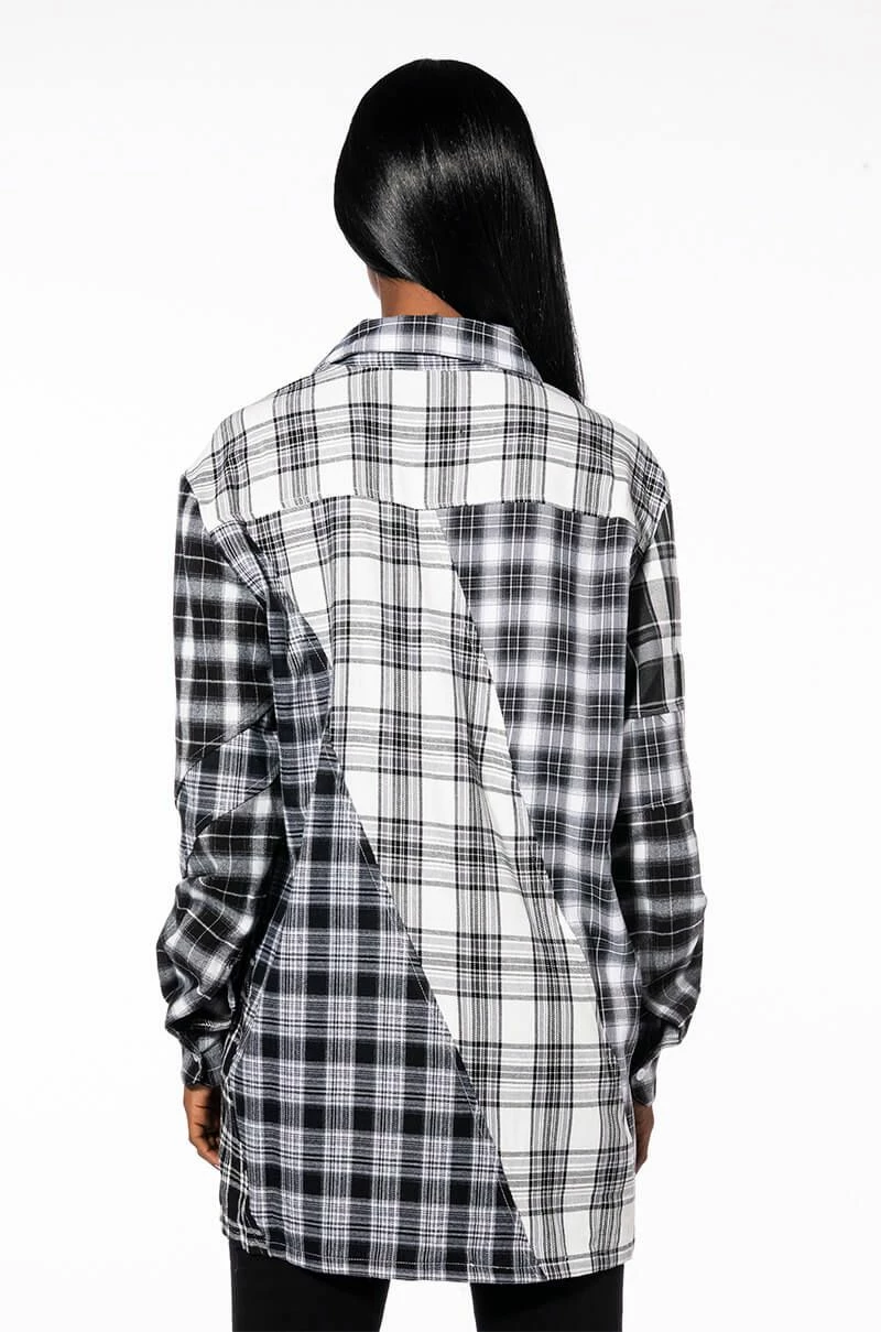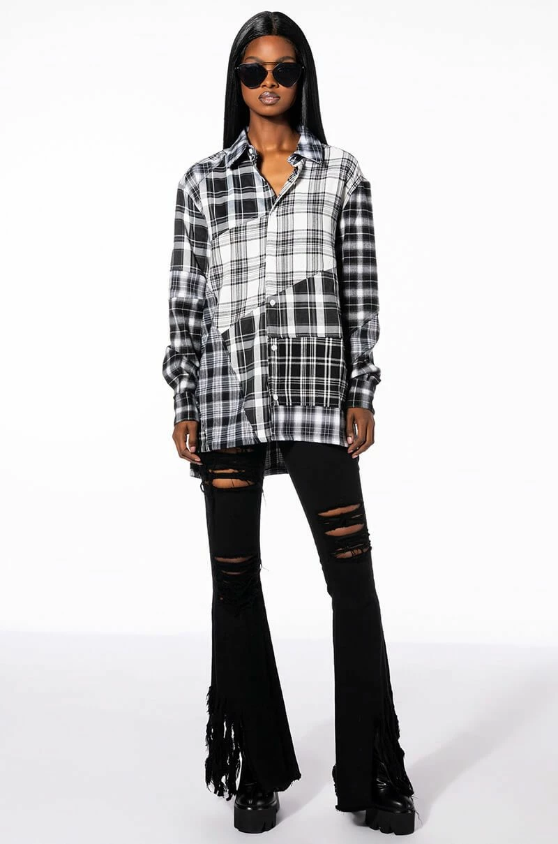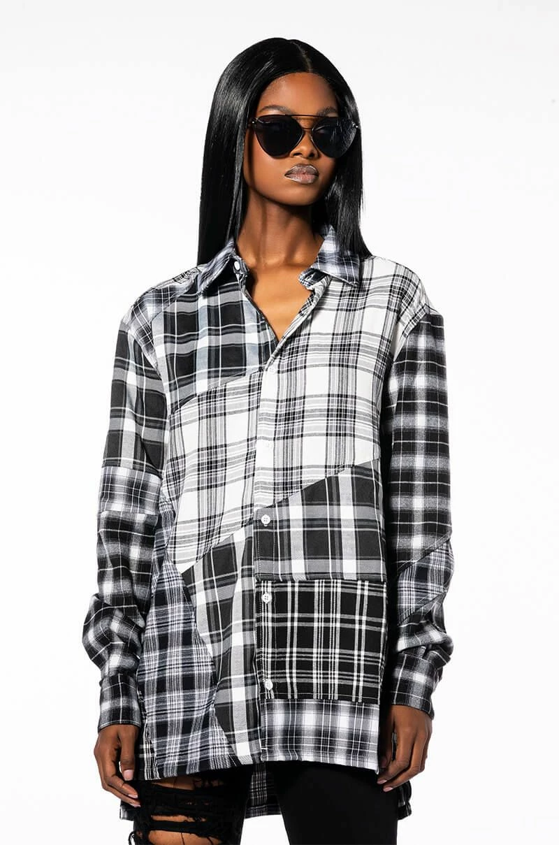 The AKIRA Label Serving Plaid Button Down Blouse is made from a patchwork cotton plaid fabrication and features a collared neckline, long sleeves with button cuff wrists, a longline silhouette, and a button down front closure. Pair this twist on a seasonal staple with distressed jeans and combat boots to complete your look.