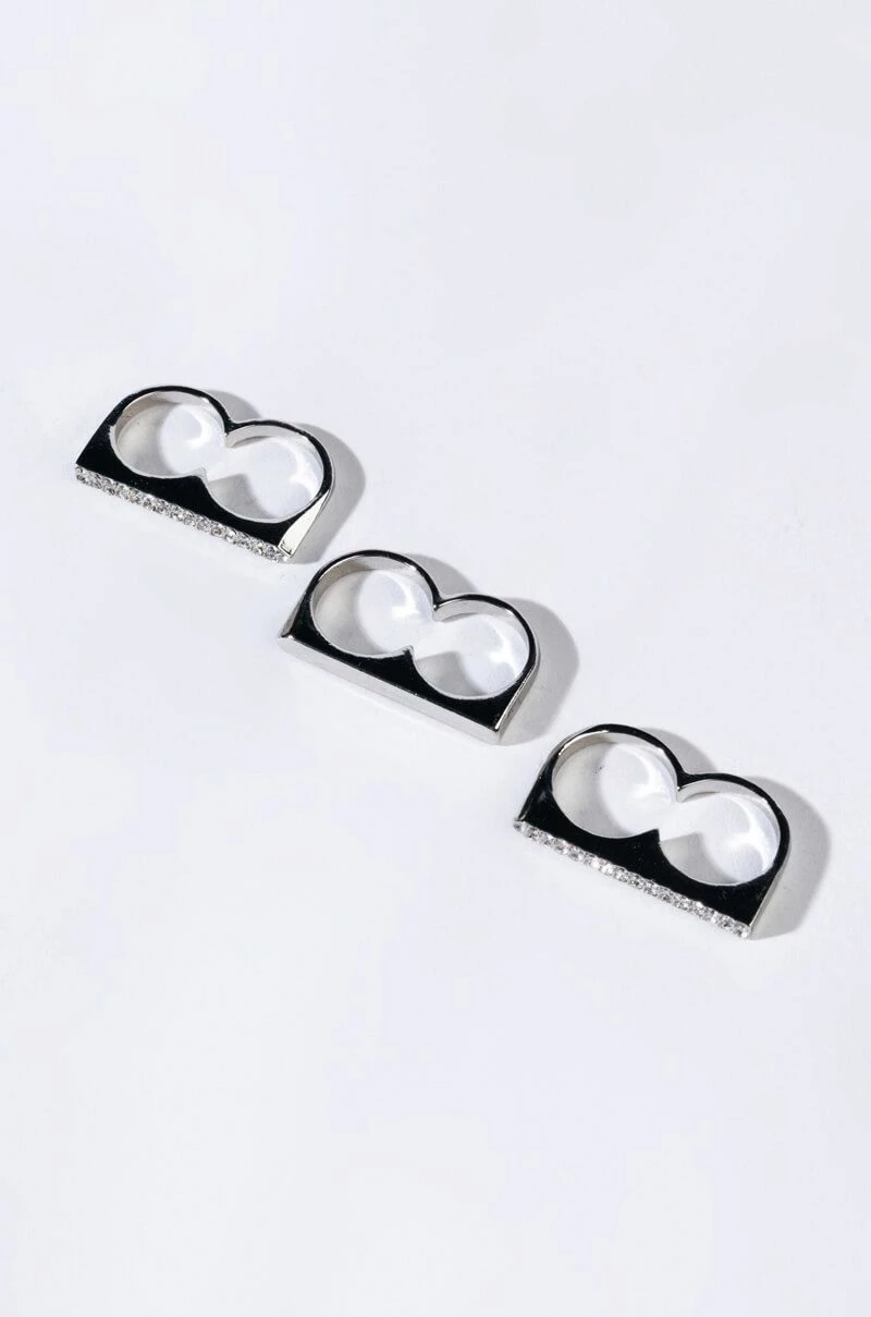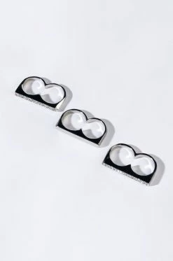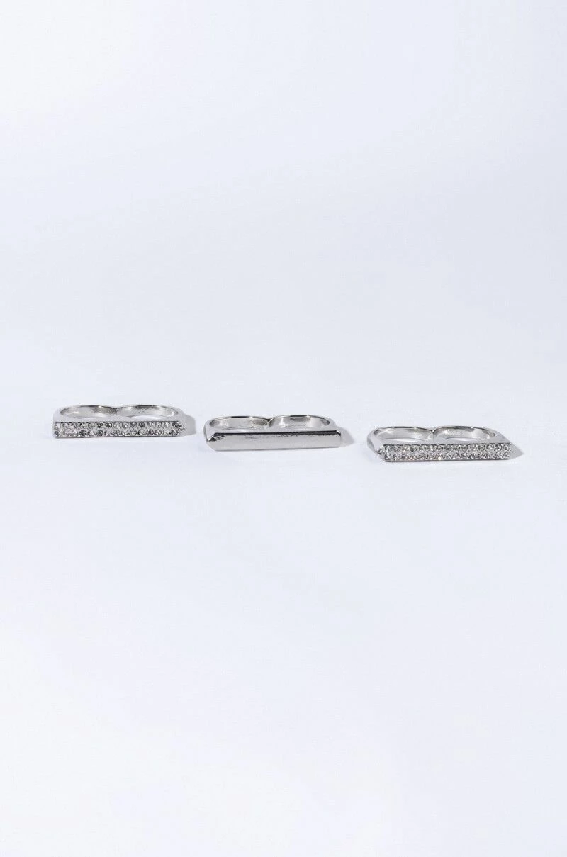 The AKIRA Label Set The Bar High Ring Set is a set of three fierce two-finger bar rings with rhinestone detailing. Wear them separately or layer them up for all the bling!
