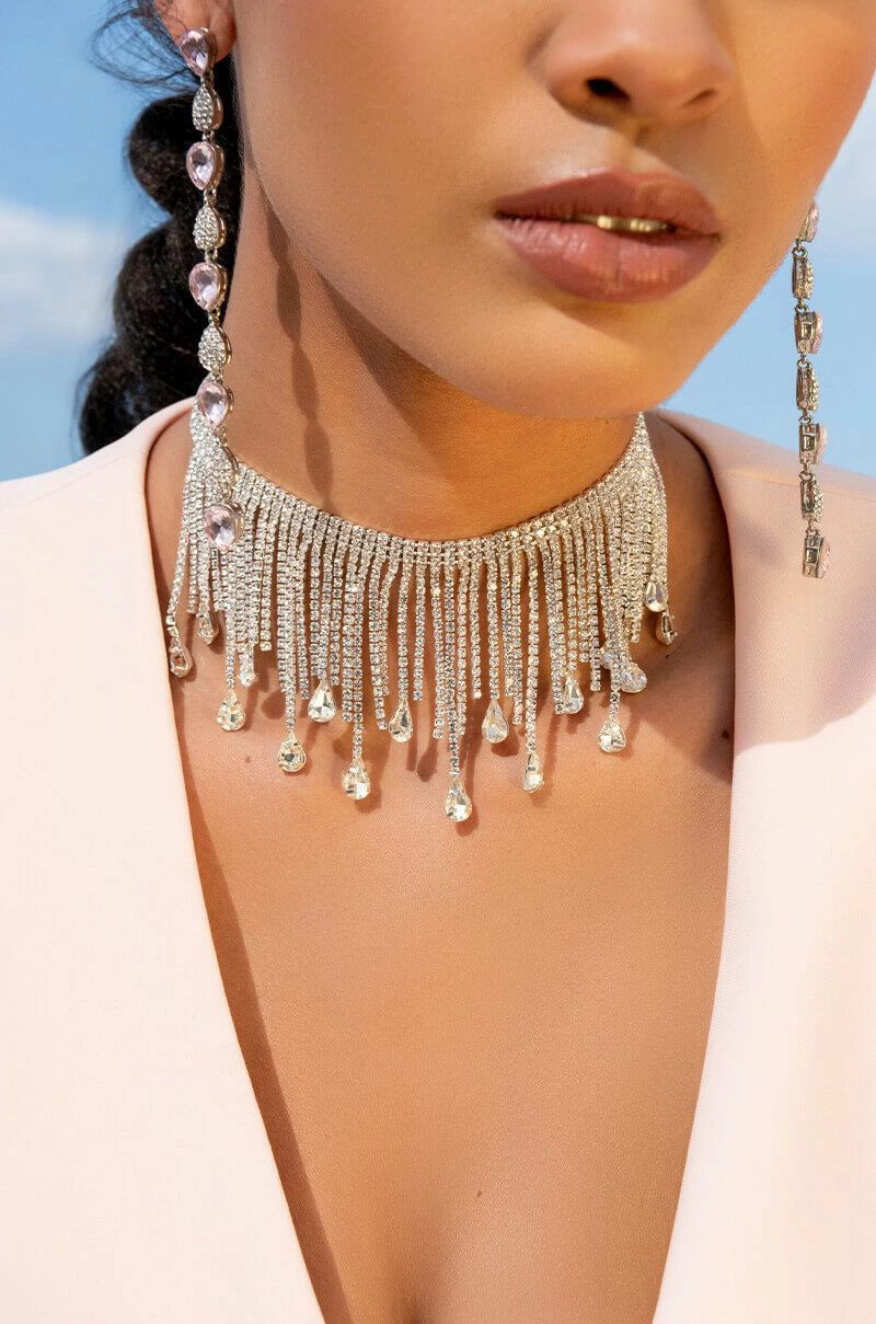 The AKIRA Label Sheβs A Maniac Dropping Choker features a rhinestone link base, dangling rhinestone fringe, rhinestone teardrop accents, and an adjustable lobster claw fastening.