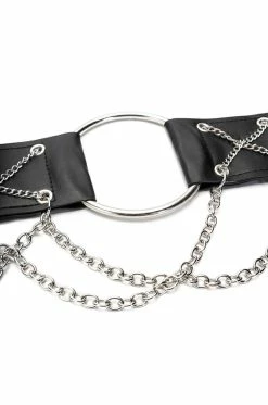 The AKIRA Label Shes Feisty Chain Belt features a faux leather base, silver metallic hardware, o-ring accents, chain link detailing, and coordinating draped chain links. Complete with a waist-cinching silhouette and button back closures.