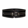 The AKIRA Label Shiloh Studded Western Fringe Belt is made from a faux leather fabrication and features a wide band with a Western-style design, studded trim, and a faux leather fringe hem. Complete with adjustable back buckle closures.