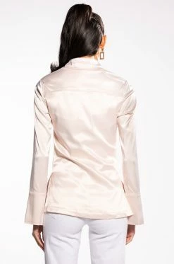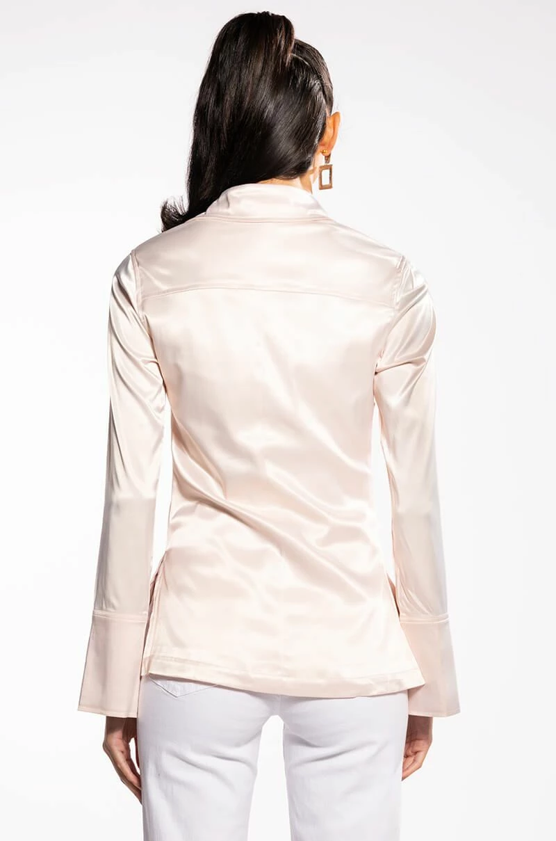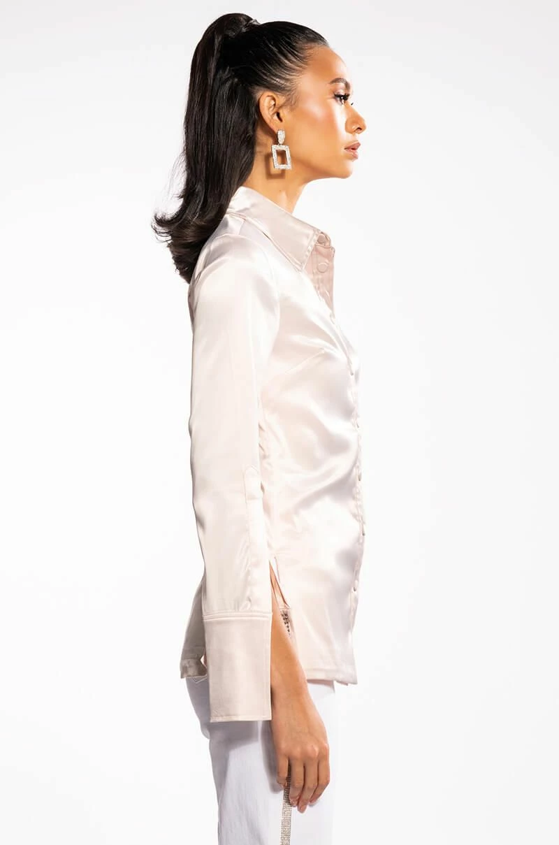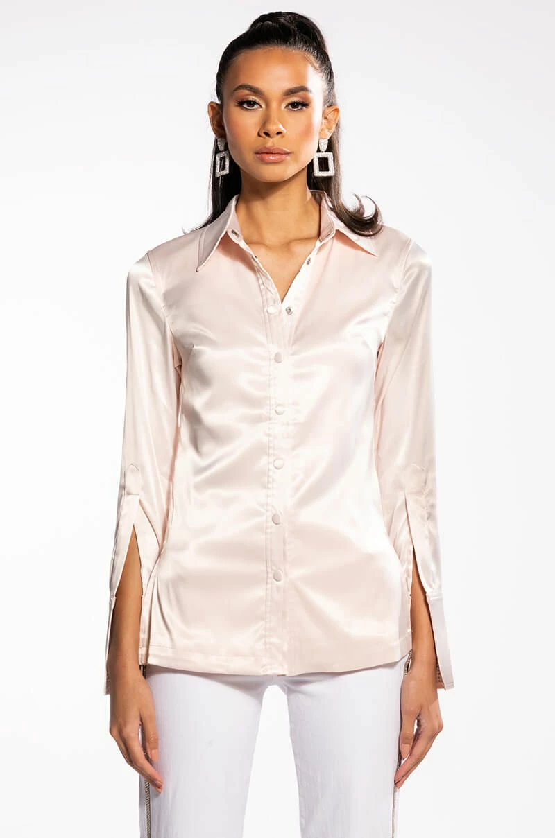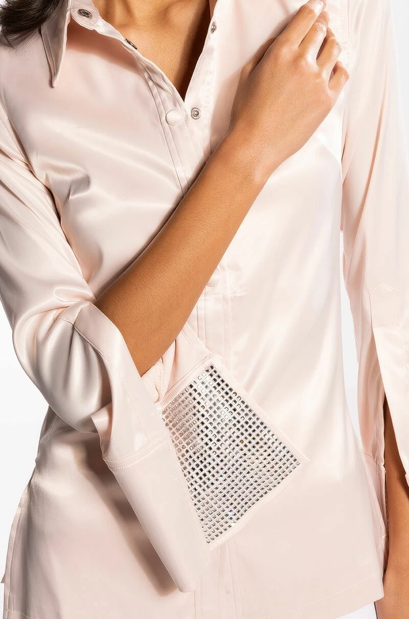 The AKIRA Label Shine On Embellished Satin Button Down Blouse is made from a luxe satin fabrication and features a pointed collar, long sleeves with dramatic, reflective, rhinestone-embellished split cuffs, princess seam detailing, split hems, and a covered snap button down front closure. Pair this glistening garment with fitted trousers and stiletto pumps for a look that’s sure to light up any room you strut into.