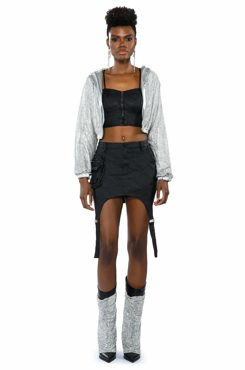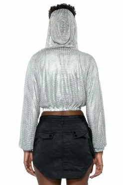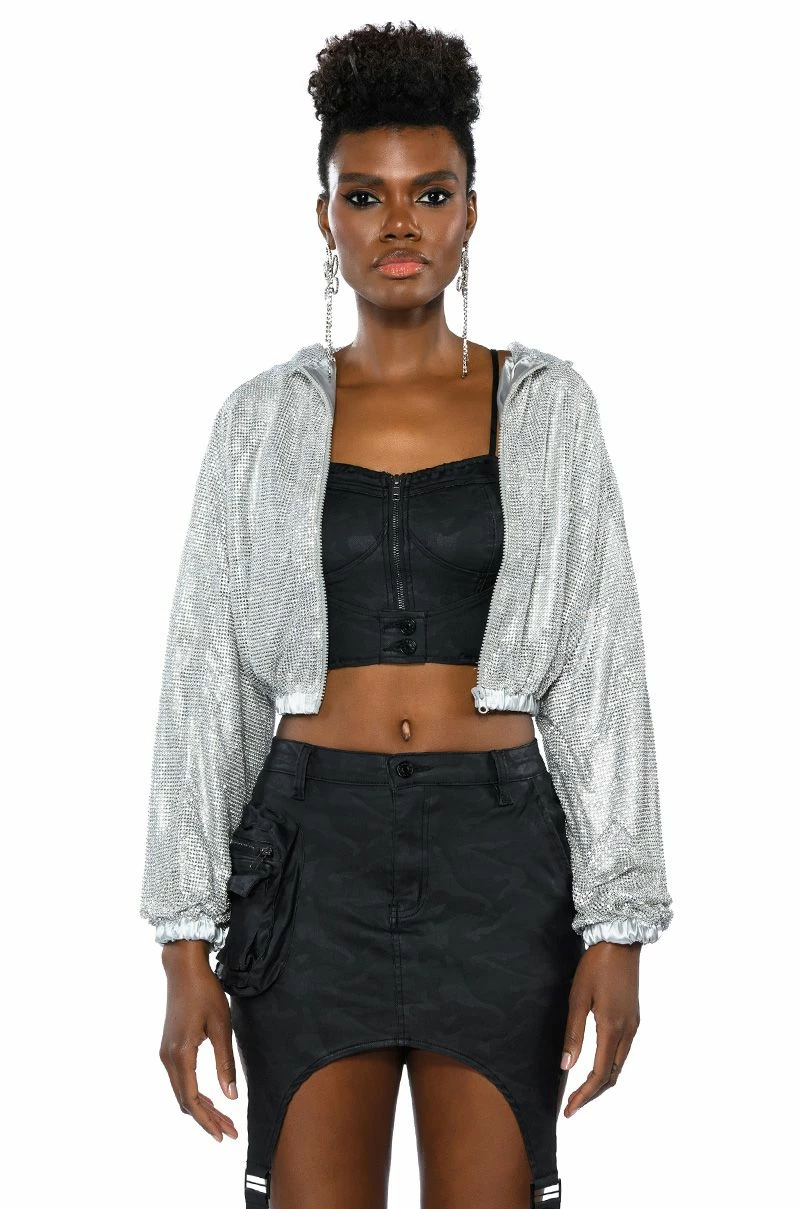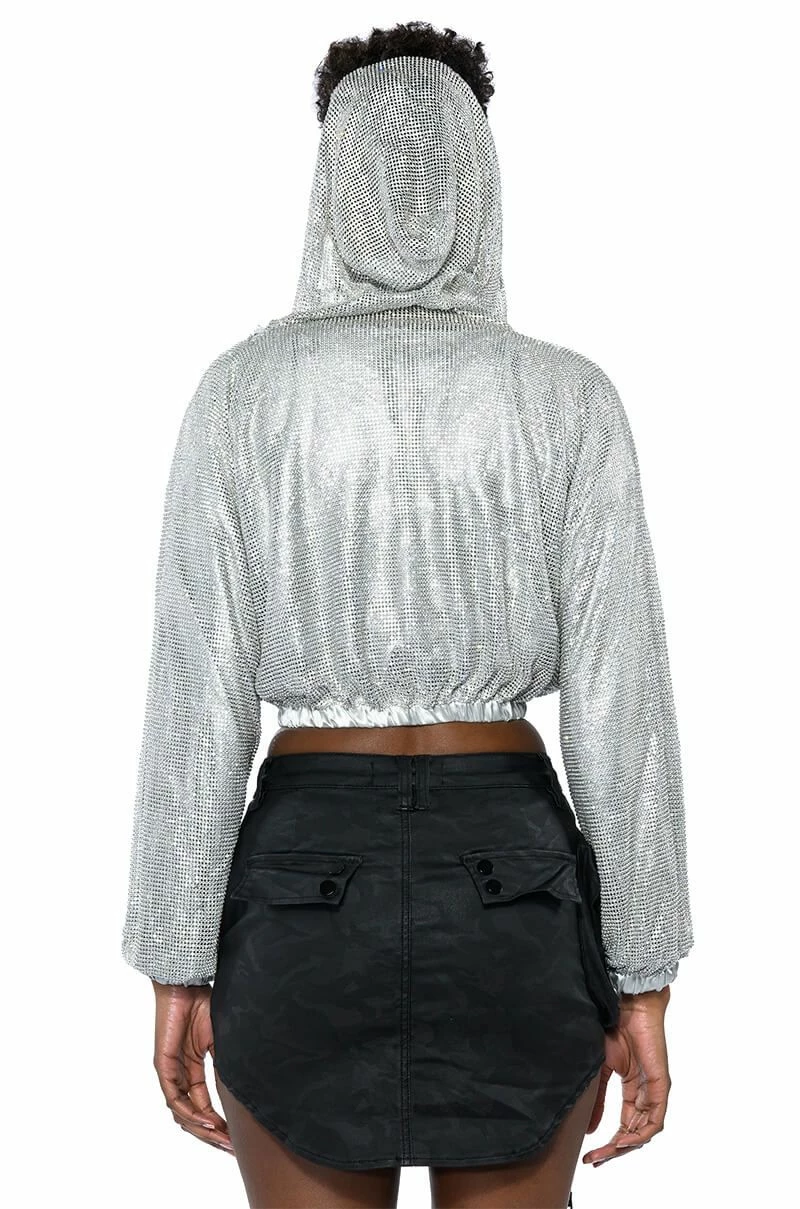 The AKIRA Label Shine Star Rhinestone Chainmail Crop Hoodie is made from a glistening rhinestone chainmail base and features an attached hood, long sleeves, a cropped silhouette, elastic hems, and satiny lining. Complete with a front zipper closure. Pair this piece with wide leg cargo pants and chunky sneakers to finish off your stardom-ready look.
