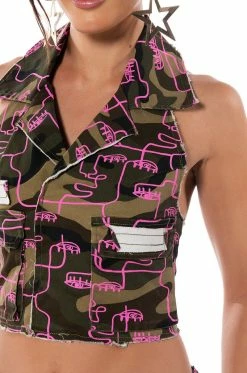 The AKIRA Label Silhouette Print Camo Collared Halter Top is made from a stretchy cotton fabrication and features a camo print with a graphic print silhouette overlay, a collared halter neckline, a sleeveless silhouette, front flap cargo pockets, a sexy open back, a cropped length, distressed hems, and an exposed back zipper closure. Pair this piece with the coordinating AKIRA Label Silhouette Print Camo Cargo Pant and combat boots to complete your look.