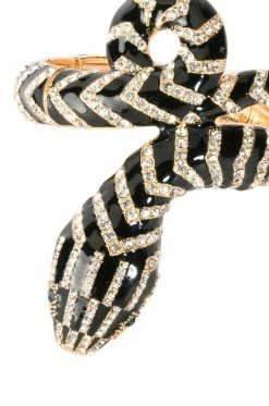 We have a sneaking suspicion this shimmering statement piece is right up your alley. The AKIRA Label Slithery Snake Wrap Bracelet features a one-size-fits-most cuff design complete with a faux gold metallic base, rhinestone detailing, black enamel stripe accents, and rhinestone-embellished snake silhouette. Complete with elastic backing, this one-size-fits-most piece stretches to slip on the wrist.