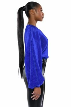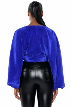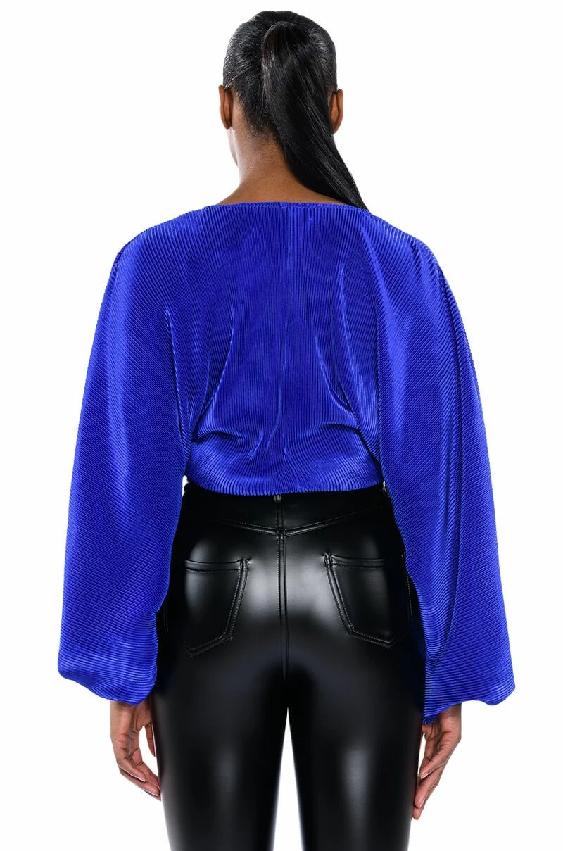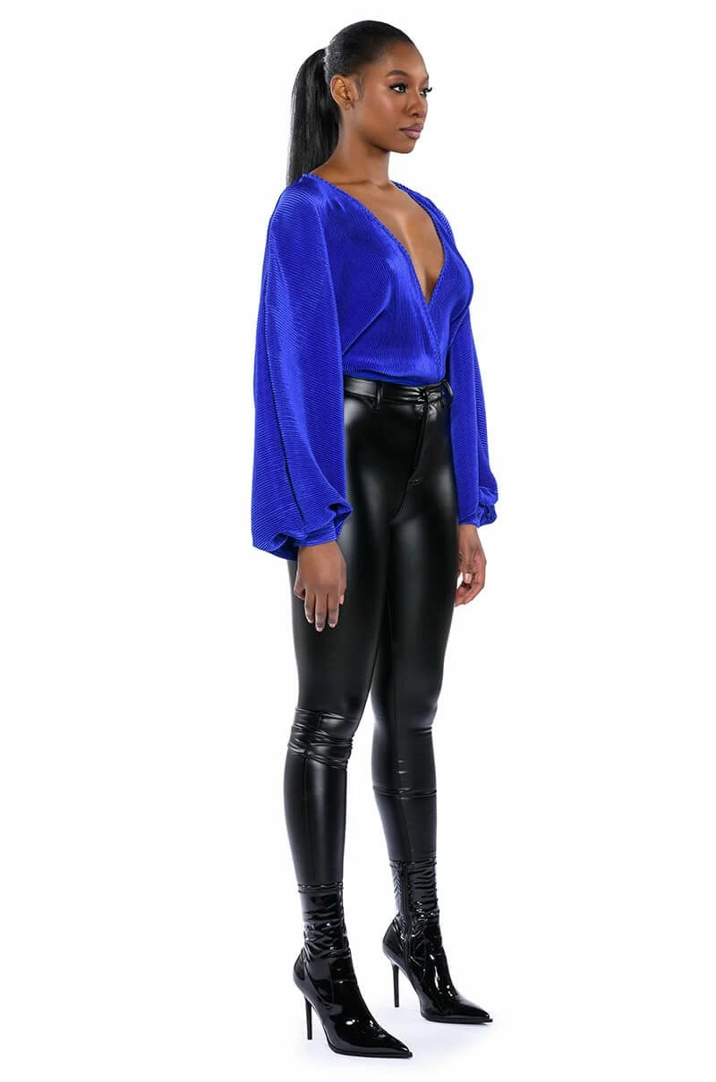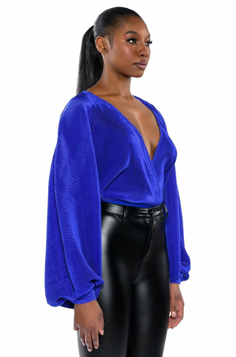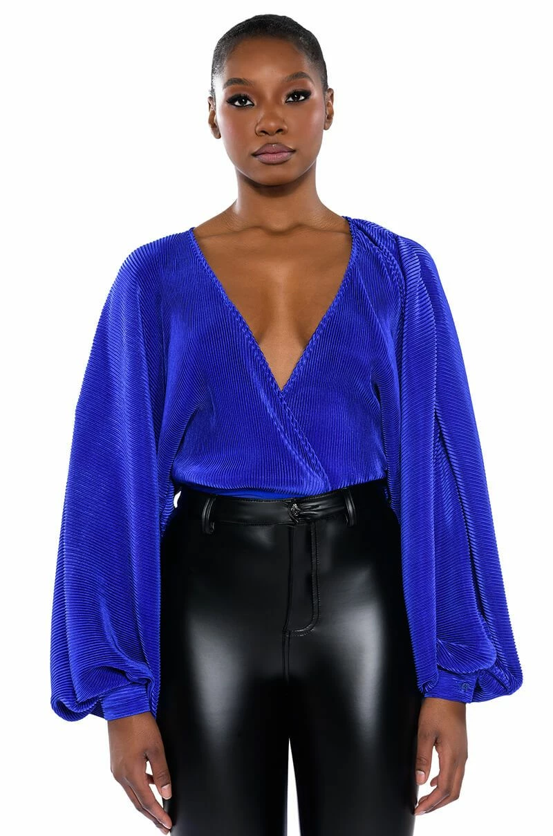 The AKIRA Label Slow Motion Long Sleeve Wrap Front Bodysuit is a shimmering satin top featuring a pleated accordion base, a plunging neckline, long blouson sleeves, an attached mesh thong bottom, and a snap gusset closure. Pairs perfectly with palazzo pants and platform sandals.