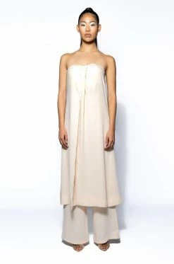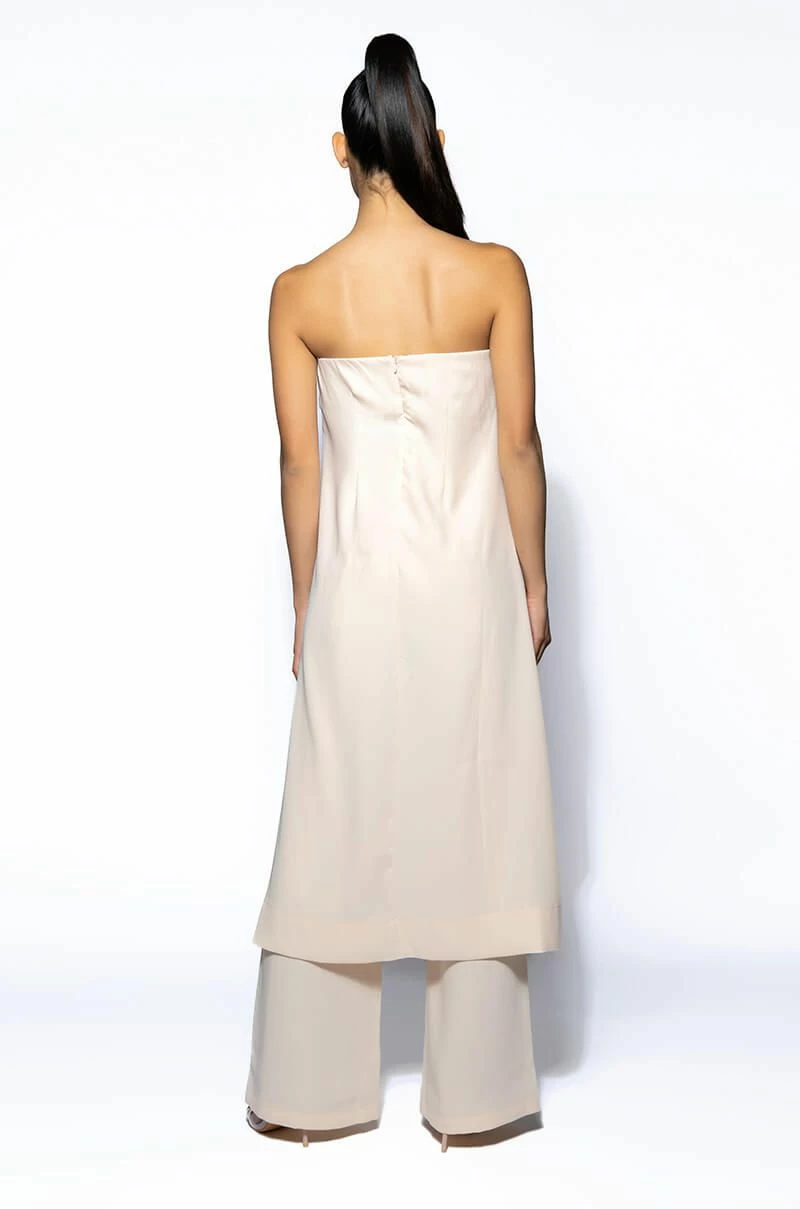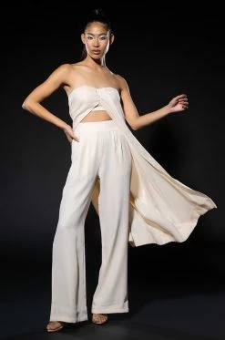 The AKIRA Label So True Strapless Top is made from a smooth fabrication and features a strapless design, an inner bralette with padded cups and an elastic hem, a cascading open front, a longline silhouette, and a tonal back zipper closure. Style this piece with the coordinating AKIRA Label So True Palazzo Pant to complete your look.