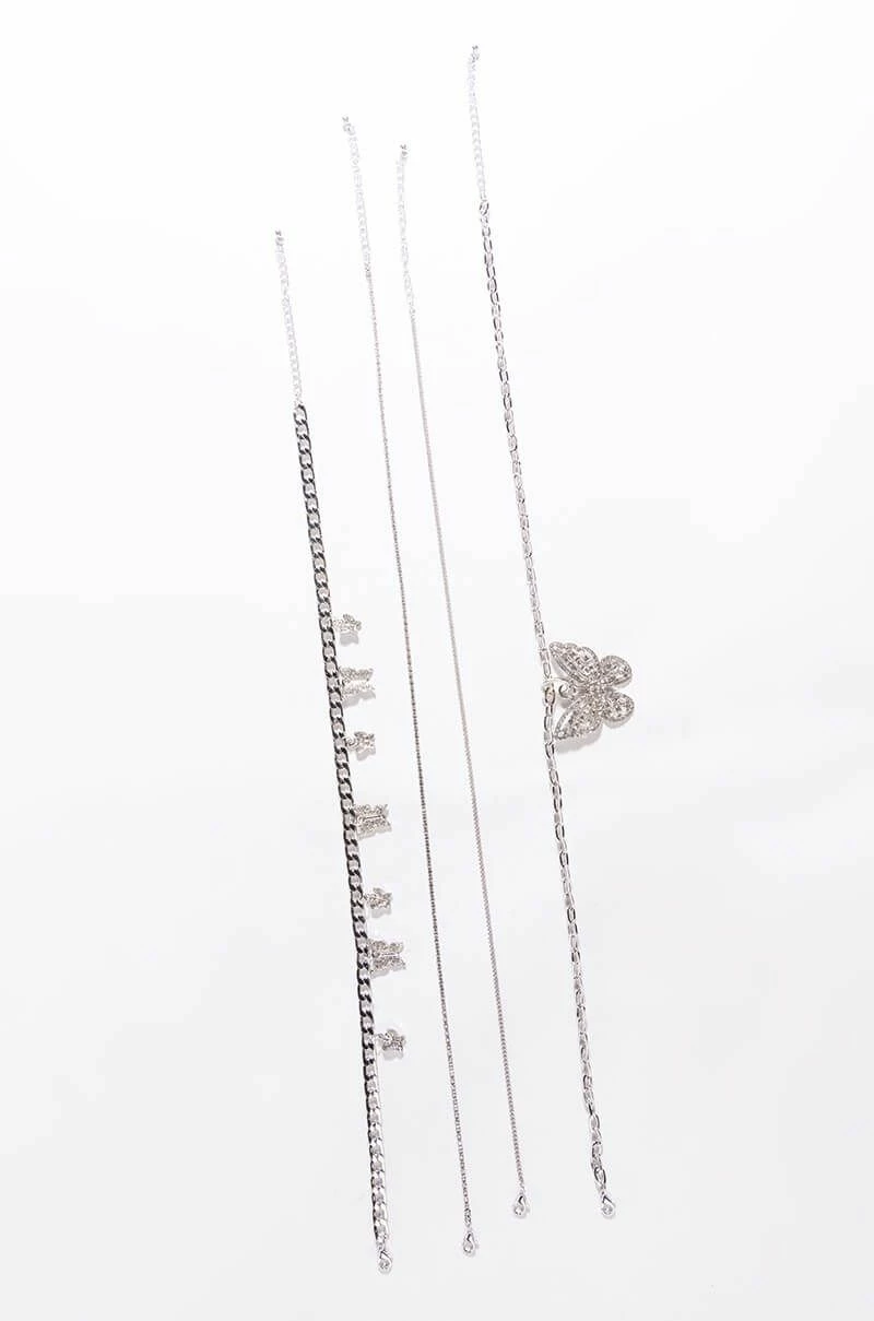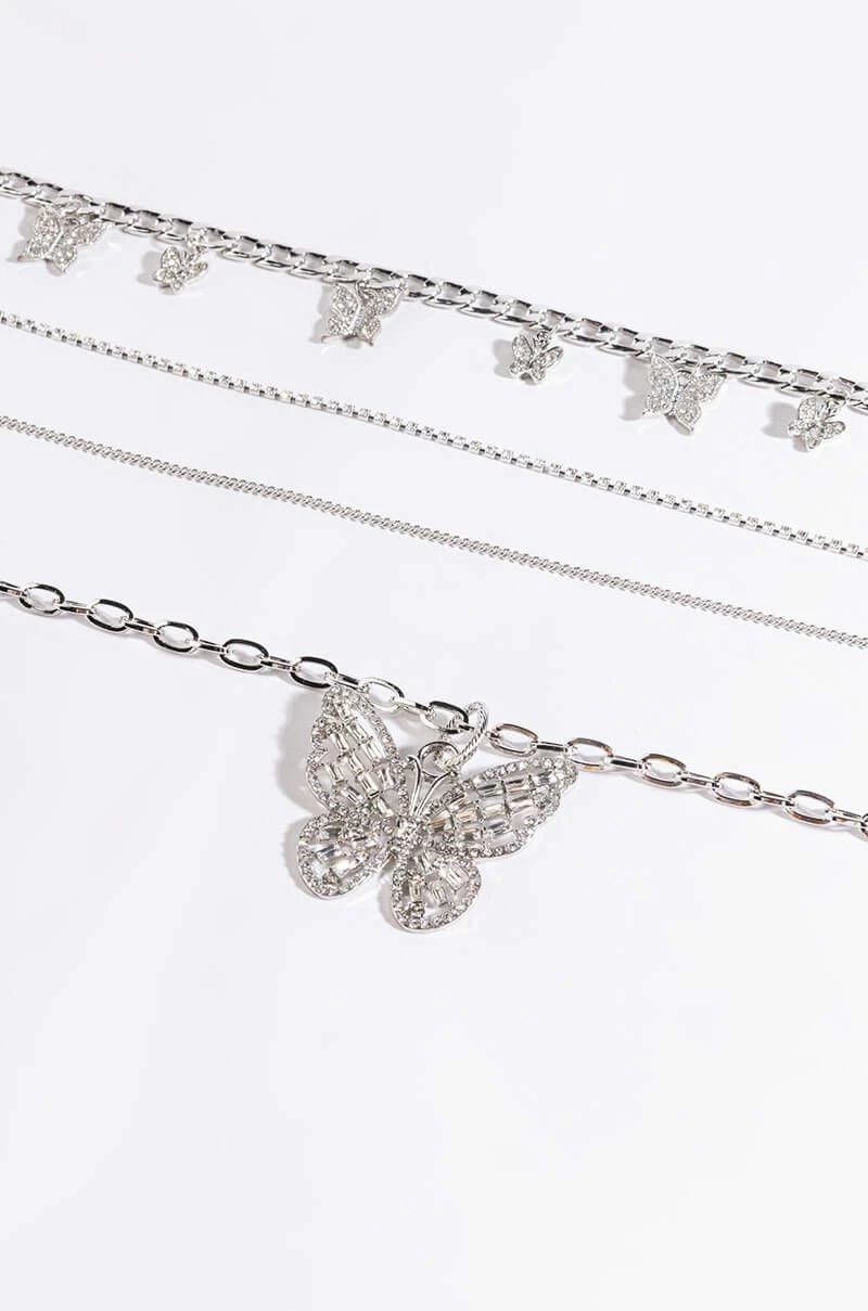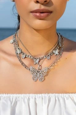 The AKIRA Label Social Butterfly Necklace Set is a set of four faux silver necklaces featuring: a thin chain necklace, a thin rhinestone link necklace, a curb chain necklace with small rhinestone butterfly charms, and a cable chain link necklace with a rhinestone butterfly pendant. Each necklace is complete with an adjustable lobster clasp closure. Wear them separately or style them together for all of the butterfly bling!
