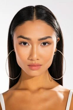 The AKIRA Label Sparkle Silver 100MM Rhinestone Hoops are a slender, ultra-oversized 100mm silver metallic hoop earring featuring pave rhinestone detailing and a classic post back fastening. Perfect for adding drama to any ensemble!