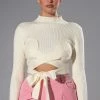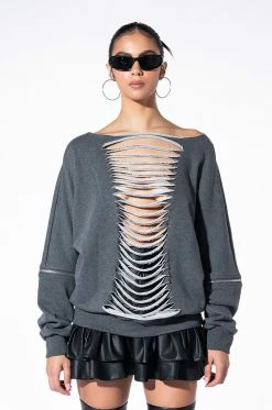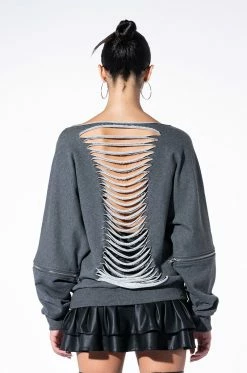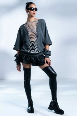 Rocker chic style is timeless. The AKIRA Label Forever Favorite Shredded Detail Sweatshirt features a knit fabrication, a longline silhouette, a boat neckline, and shredded front and back detailing. Complete with convertible zip off long sleeves. This piece can be worn as a short sleeve or long sleeve sweater. Pairs perfectly with cargo pants and a cropped tank.