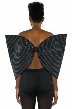 The AKIRA Label Standing Ovation Pinstripe Rhinestone Dramatic Bow Top is made from a slick fabrication and features a strapless sweetheart silhouette, pinstripe rhinestone detailing, a large, reinforced bow design, a sexy open back, elastic shoulder bands for structure, and a pull-on fit. Pair this piece with pant boots and gloves to complete your extravagant look.
