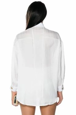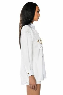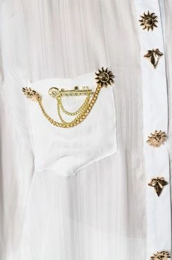The AKIRA Label Stay Fly Oversized Button Down Blouse is a luxe sheer piece featuring three quarter length sleeves, a button down front placet, unique faux gold and bronze metallic button detailing, dual chest pockets, draped chain link pin accents,and a collared neckline. Complete with a longline silhouette and an oversized design. Style this flowy piece atop trousers and a corset for an elegant dinner date look.