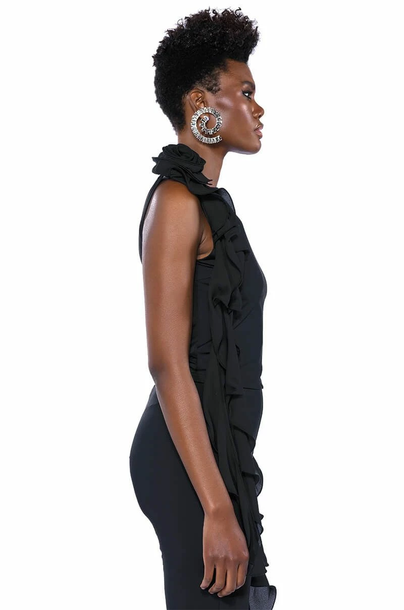 The AKIRA Label Stella Flounced Sleeveless Top is made from a sleek, stretchy base fabric and features a boat neckline, a bodycon fit, and a flouncy, mesh floral applique with a cascading ruffle detail on the shoulder. Complete with a sleeveless silhouette and a slip-on design. Style with the matching bottoms, The AKIRA Label Stella Flounced Flared Legging, for that chic, it-girl look.