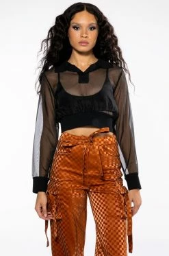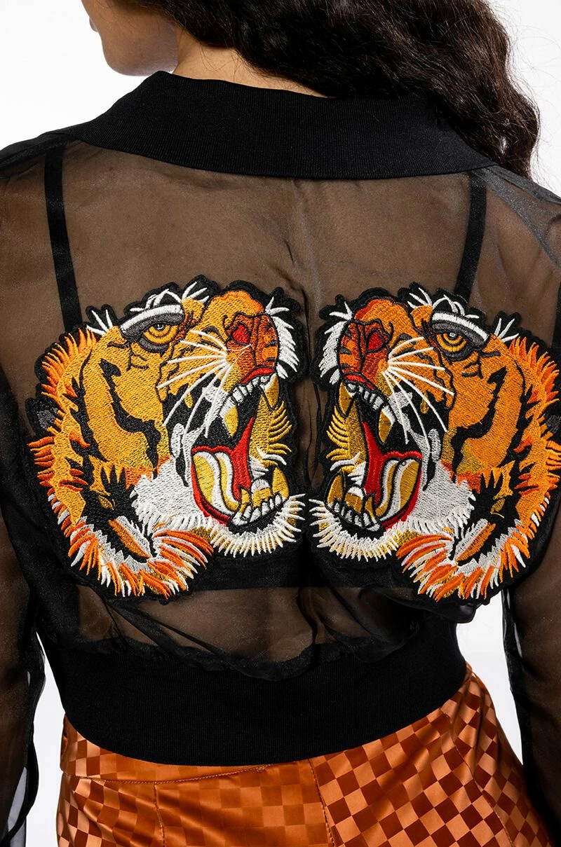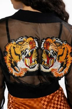 The AKIRA Label Strike Out Sheer Mesh Crop Polo Top is made from a sheer mesh fabrication and features a ribbed knit polo collar, long sleeves with ribbed knit cuffs, a cropped silhouette, and a stretchy ribbed knit hem. Complete with large roaring tiger back patches.