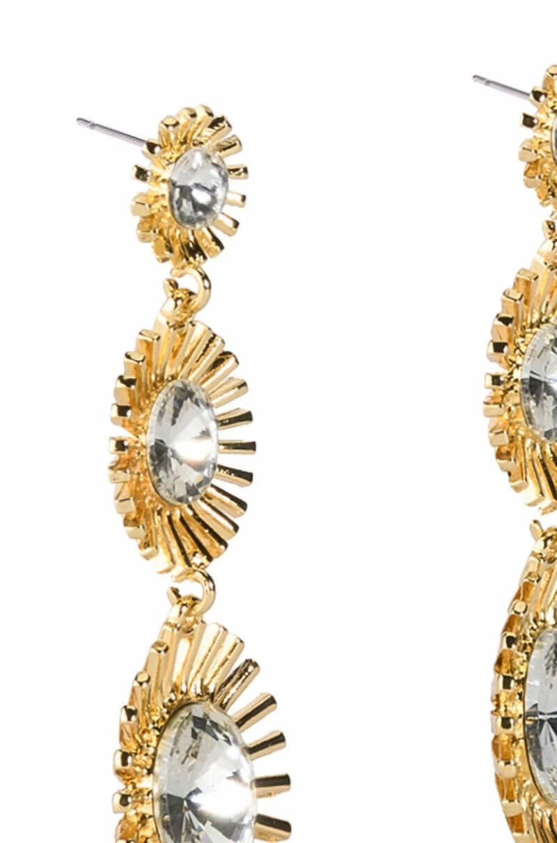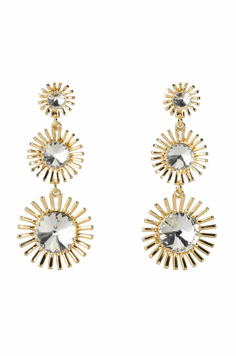 Shine bright in The AKIRA Label Stunner Status Rhinestone Sunburst Drop Earrings. These faux gold metallic drop earrings feature descending sunburst designs and shimmering circular rhinestone accents. Complete with a traditional post back fastening.