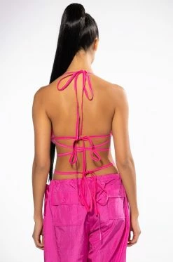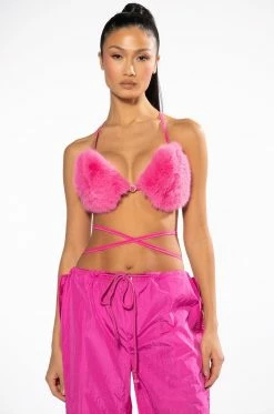 The AKIRA Label Such A Doll Faux Fur Bralette is a Y2K-inspired faux fur triangle bra featuring fluffy bust cups, a circular rhinestone center detailing, tie back straps at the neck and back, and wrap around straps for the waist. Style this bra underneath the coordinating AZALEA WANG Such A Doll Faux Fur Jacket.