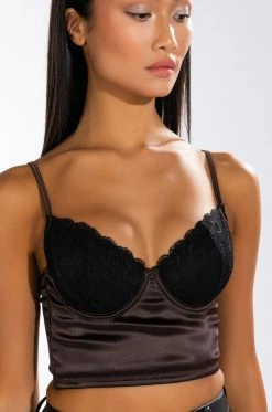 The AKIRA Label Sultry Longline Lace Bralette Top is made from a shiny fabrication base and features adjustable spaghetti straps, a plunging neckline, lined lace-detailed cups with underwiring, a cropped length, side boning for structure, and back hook and eye closures.